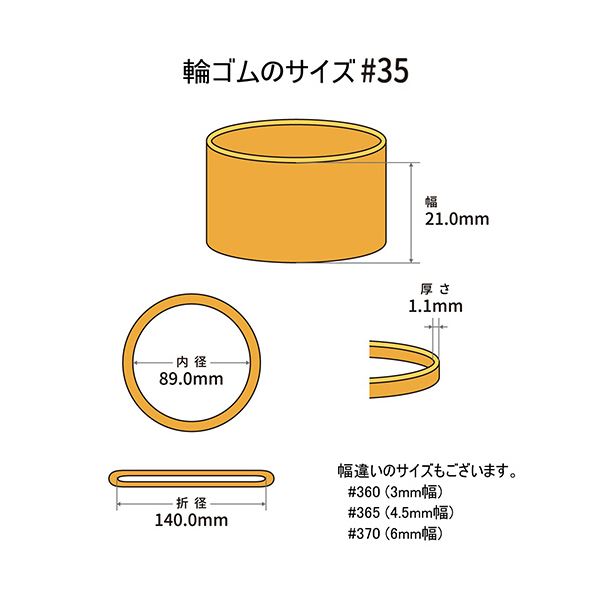 ■商品内容【ご注意事項】この商品は下記内容×3セットでお届けします。結束、包装、縫製などに広範囲に利用でき、作業性、経済性に優れています。●番手#35のゴムバンド、気軽に使用しやすい少量包装・50g。●少量なので、家庭用やオフィス事務用品、サイズお試し用(試作用)などに。●良質の天然ゴムを使用し、菓子のアメに似た色をしているところから、「アメバンド」もしくは「アメ配合」と呼ばれています。■商品スペックサイズ:#35色:アメ内容量:50g切り幅:21mm内径:89mm折径:140mm厚さ:1.1mm材質:天然ゴムその他仕様:●参考平均本数:9本●推奨結束径:300〜500mm(1重巻きを想定した参考値)シリーズ名:オーバンド■送料・配送についての注意事項●本商品の出荷目安は【5 - 11営業日 ※土日・祝除く】となります。●お取り寄せ商品のため、稀にご注文入れ違い等により欠品・遅延となる場合がございます。●本商品は仕入元より配送となるため、沖縄・離島への配送はできません。