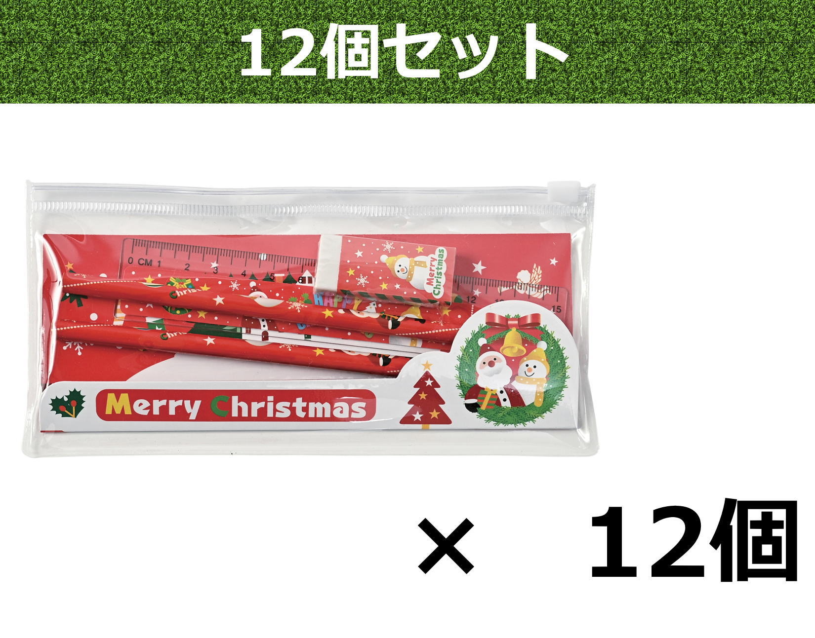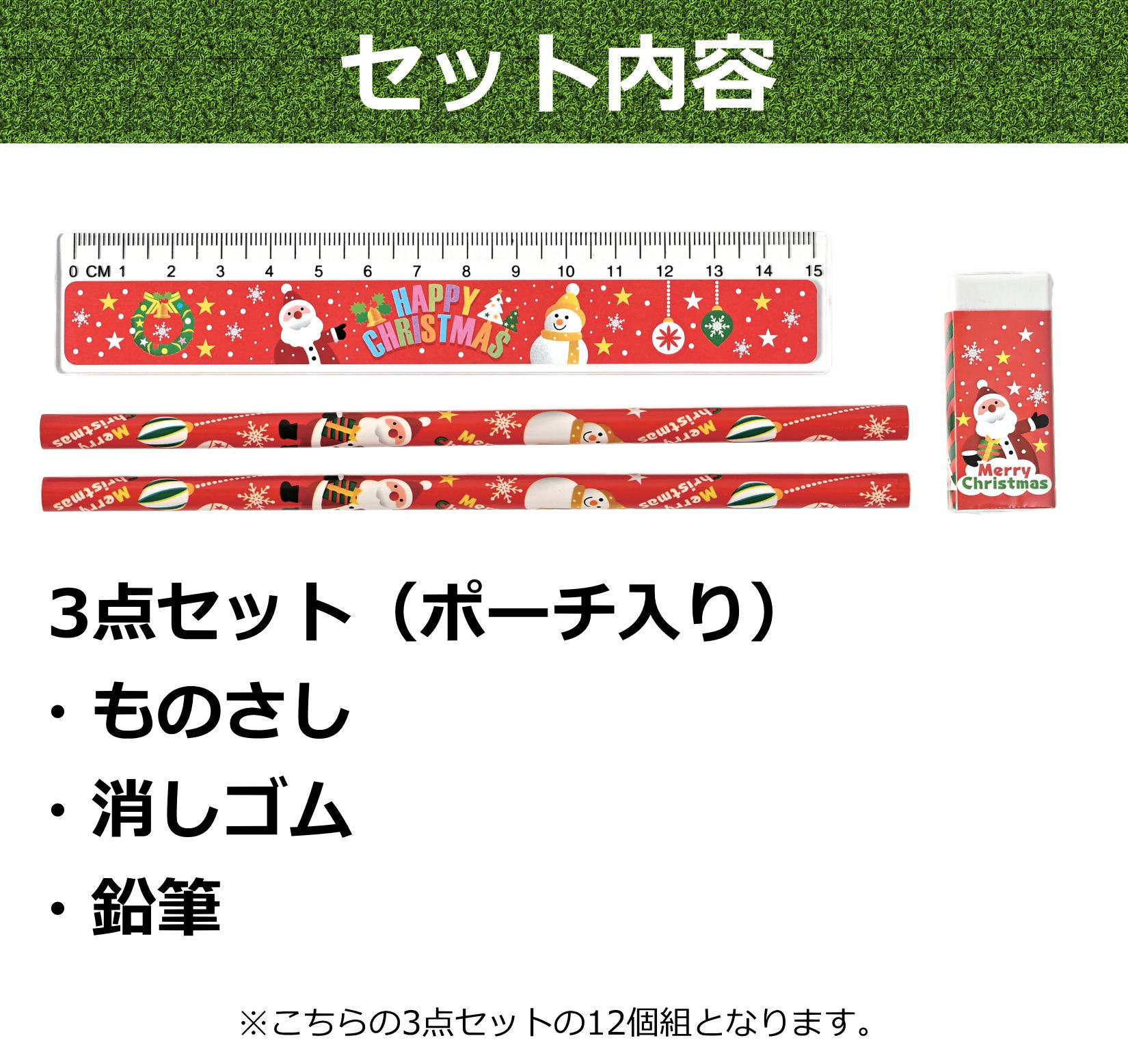 【12個セット】クリスマス 文房具3点セット サンタ柄 鉛筆・消しゴム・定規入りの3点がポーチに入った文具3点 ステーショナリー3点セット 景品 クリスマス会 子供会 イベント配布用 セット販売 まとめ買い