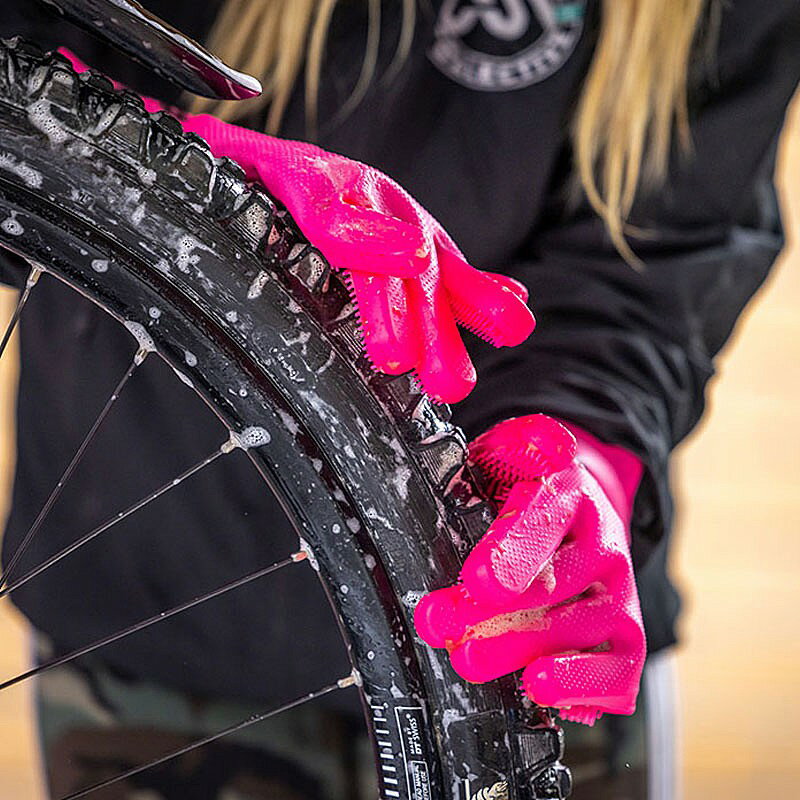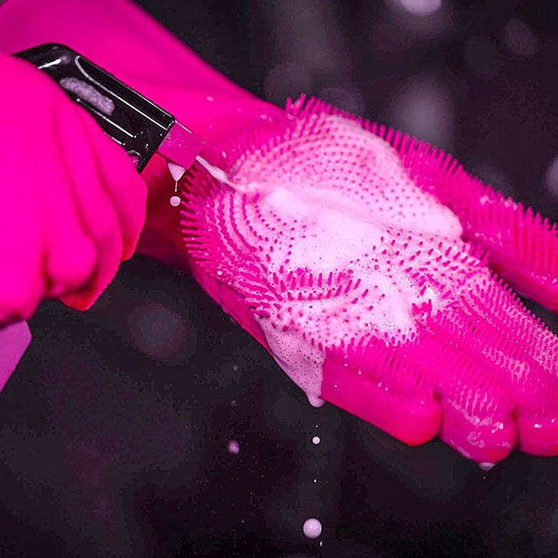 ■ Muc-Off(マックオフ) Muc-Off(マックオフ)は、イギリス発のケミカル&メンテナンス・アクセサリーの総合ブランドです。 製品のラインナップはサイクル用だけでなく、モーターサイクル、自動車、エレクトロにクス、マリンなど多岐にわたります。 Muc-Offは分かりやすい「ステージ・システム」によって、簡単に楽しく、機材を最高のコンディションに整え、見た目も美しく保つことができます。■商品詳細 そのまま「手」で洗える グローブ自体がブラシになった革新的なSCRUBBER GLOVES DEEP SCRUBBER GLOVESは、高強度・高耐久性のシリコンで作られた洗車用のグローブ。 手袋自体がブラシの役割をするので、ブラシやスポンジでは届かなったパーツの隙間や細部まで簡単に直感的にクリーニングすることが可能です。 使い方はバイククリーナーをフレームにやクリーニングしたい場所にかけて手でなぞりながら洗うだけ。手袋に直接クリーナをつけて洗浄することもできます。 グローブ自体は230℃の熱さまで耐える設計で、グローブの汚れを落とす際は熱いお湯で洗浄も可能。 食品用にも使えるPBAフリーの安全なシリコンを使用し、非腐食性で環境にも配慮しています。