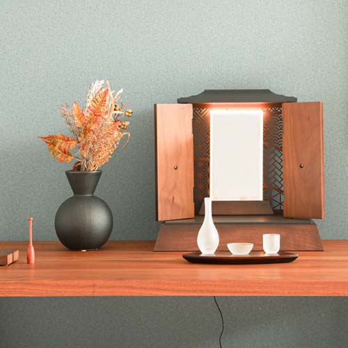 一緒に過ごすためのシンプルなお仏壇【ヌック】お部屋になじみやすいナチュラルなミニ仏壇。傷つきにくい特殊コーティングと防汚加工を施しているので簡単なお手入れで美しさを保てます。リビングはもちろん、玄関や寝室にも安置していただきやすいようコンパクトなサイズに仕上げました。時代が変わってもフィットしやすいプレーンなデザインなので、無理なく次世代へご供養を引き継いでいただけます。商品情報【色】PN色-ホワイトPN色-グラスグリーンN色-ソラN色-サクラ【素 材】PN色/PVC化粧シートN色/オレフィン樹脂化粧板基材:MDF【サイズ】外 寸 :幅350×奥行125×高さ360mm内 寸 :幅319×奥行105×高さ237mm収納内寸 :幅285×奥行78×深さ52mmステージ面:幅316×奥行80mm【重量】3.9kg【生産国】日本【ご注意点】手作りのためひとつひとつ木目模様が異なります。特殊コーティングを施していますが、傷や汚れの度合いにより効果が得られない場合がございます。【お手入れ方法】本体、生地部分は撥水加工を施しているため、水拭きが可能です。固く絞った柔らかい布をご使用ください。生地部分の汚れにアルコール類をお使いになる場合は目立たない部分で試してからご使用ください。【その他の取り扱い商品】ミニ仏壇のラインナップはこちら位牌のラインナップはこちら仏具のラインナップはこちら