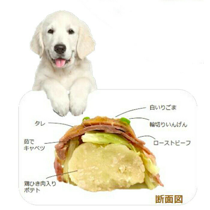 お肉好きのワンちゃん待望の、ローストビーフ丼風の登場です。 ごはんの代わりには鶏ひき肉入りのポテトとキャベツ。 覆い尽くすようにのせたローストビーフの上にタレとインゲンと白ごまをトッピングして、見た目にも豪華な一品の完成です! 原材料:じゃがいも(国産)、キャベツ、ローストビーフ、ローストビーフ用ソース、鶏肉、ごま、いんげん/増粘剤(加工でん粉)、カラメル色素、(一部に牛肉・ごま・鶏肉を含む) カロリー 97kcal(1包装当り) 愛犬の体重別の給与目安(1日あたり) ※愛犬に与える場合:愛犬用の一般食として、以下の給与目安を参考に与えてください。 3kg259kcal 5kg370kcal 10kg629kcal 20kg1055kcal アレルゲン(特定原材料等27品目) 牛肉、ごま、鶏肉