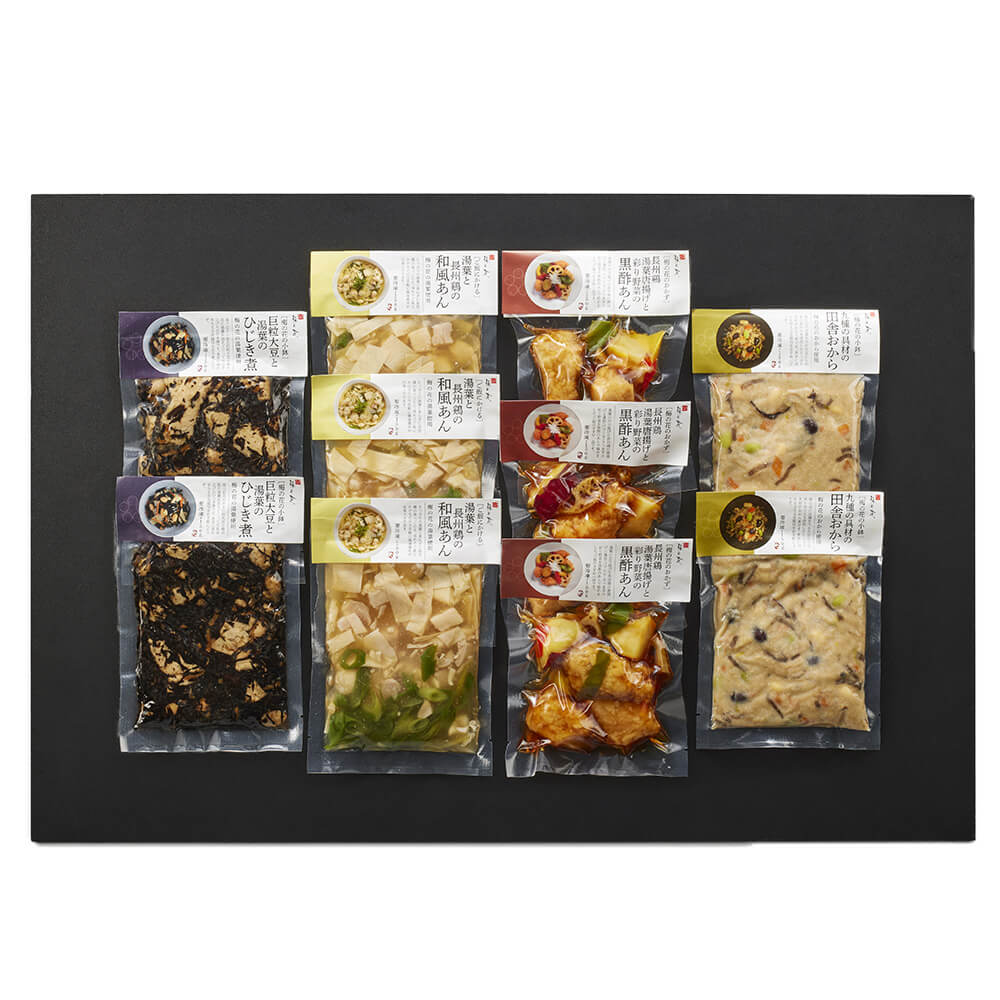 ■配送不可地域:沖縄・離島は配送不可 ■温度帯:冷凍 ■アレルゲン表示:(義務7品目)小麦 ■アレルゲン表示:(推奨21品目)ゴマ、サバ、大豆、鶏肉 ■賞味期限:出荷日より冷凍で60日(最低保証:お届け先様へ最低でも1/2以上を確保した状態でお届け) ■規格:3色大豆の田舎おから煮150g、巨粒大豆と湯葉のひじき煮150g×各2、湯葉と長州鶏の和風あん150g、長州鶏湯葉唐揚げと彩り野菜の黒酢あん150g×各3 ■サイズ(mm):264×217×76 ■発送の目安:ご注文後(決済確認後)、4~5営業日以内の発送予定。 ■備考:北海道への発送は、発送地に関わらず追加送料1100円を頂戴いたします。地域によっては一部配送業者が異なる場合がございます。