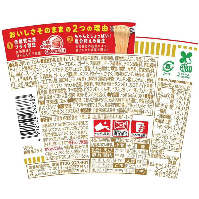 【レギュラー】箱JAN:4902105287385 【商品説明】 日清 カップヌードルPRO 高たんぱく&低糖質 さらに塩分控えめ 75g 高たんぱく&低糖質だけでなく、 塩分も控えめに! 「カップヌードル」の味わいと食べ応えはそのままに、 たんぱく質を15g配合し、糖質50%オフ、 塩分25%オフを実現しました(カップヌードル比)。 【使用方法】 1.フタを半分まではがし、熱湯を内側の線までゆっくり注ぐ。 2.フタをして3分後よくまぜてOK! 【日清 カップヌードル PRO 高たんぱく 高蛋白 低糖質 塩分控えめ カップヌードルプロ cupnoodlepro 低カロリー カップラーメン カップ麺 かっぷらーめん かっぷめん ラーメン 長期保存 保存食 非常食 夜食 間食 送料無し 送料無 送料込み 送料込】 複数箱ご購入の場合はこちらの送料無料商品かお得な複数箱セットをご利用ください。品名 日清 カップヌードルPRO 高たんぱく&低糖質 さらに塩分控えめ 75g 商品内容 日清 カップヌードルPRO 高たんぱく&低糖質 さらに塩分控えめ 75g×12個 原材料 油揚げめん(小麦粉(国内製造)、植物油脂、植物性たん白、食塩、しょうゆ、サイリウム種皮粉末、チキンエキス、ポークエキス、ガーリック調味料、ポーク調味料、チキン調味料、香味調味料、卵粉)、スープ(コラーゲンペプチド、粉末しょうゆ、豚脂、たん白加水分解物、糖類、香辛料、香味調味料、こしょう調味料、ポーク調味料、ガーリック調味料、メンマパウダー)、かやく(味付豚ミンチ、味付卵、味付えび、ねぎ、味付豚肉)/加工でん粉、調味料(アミノ酸等)、増粘剤(増粘多糖類、アルギン酸エステル)、香料、炭酸Ca、かんすい、カラメル色素、酸味料、酸化防止剤(ビタミンE)、カロチノイド色素、乳化剤、香辛料抽出物、チャ抽出物、ビタミンB2、くん液、ビタミンB1、(一部にえび・小麦・卵・乳成分・ごま・大豆・鶏肉・豚肉・ゼラチンを含む) 保存方法 においが強いもののそばや直射日光を避け、常温で保存してください メーカー名 日清食品株式会社〒160-8524 東京都新宿区新宿6-28-1 TEL:0120-923-301 広告文責 クイックファクトリー 0178-46-0272
