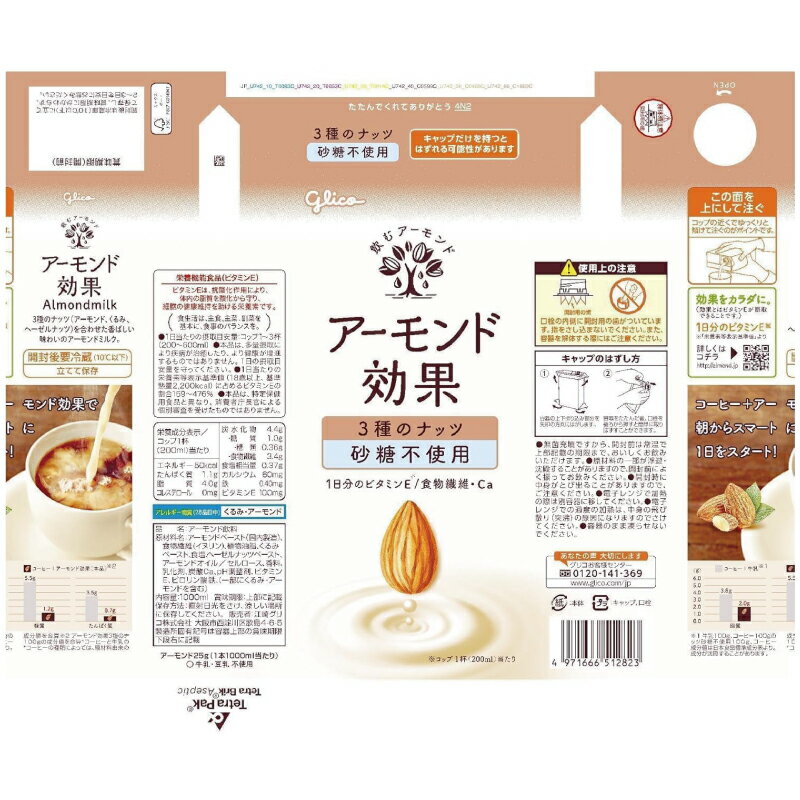 箱JAN:4971666512854 【商品説明】 グリコ アーモンド効果 3種のナッツ 砂糖不使用 1000ml 3種のナッツ(アーモンド、くるみ、ヘーゼルナッツ)を 合わせた香ばしい味わいのアーモンドミルクです。 砂糖不使用ですっきりとした飲みやすさに仕上げました。 鉄分入りです。 【グリコ アーモンド効果 3種のナッツ 砂糖不使用 くるみ ヘーゼルナッツ シュガーフリー sugarfree 鉄分 アーモンド アーモンドミルク ビタミン 1日分のビタミン 食物繊維 カルシウム 凍結粉砕アーモンド アーモンドオイル アーモンドペースト美容 健康 ヘルシー 飲料 常温保存 植物性ミルク 大容量 送料無し 送料無 送料込み 送料込】 アーモンド効果シリーズご購入の場合は こちら品名 グリコ アーモンド効果 3種のナッツ 砂糖不使用 1000ml 商品内容 グリコ アーモンド効果 3種のナッツ 砂糖不使用 1000ml ×1箱【6本】 原材料 アーモンドペースト(国内製造)、食物繊維(イヌリン)、植物油脂、くるみペースト、食塩、ヘーゼルナッツペースト、アーモンドオイル/セルロース、香料、乳化剤、炭酸Ca、pH調整剤、ビタミンE、ピロリン酸鉄、(一部にくるみ・アーモンドを含む) 保存方法 直射日光や高温多湿の場所を避けて保存してください メーカー名 江崎グリコ株式会社〒555-8502 大阪府大阪市西淀川区歌島4丁目6番5号 TEL:0120-141-369 広告文責 クイックファクトリー 0178-46-0272