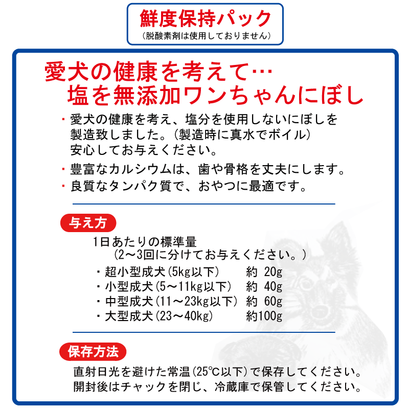 【商品説明】 サカモト 塩無添加 ワンちゃんにぼし 1kg ×3個 鮮度保持パック(脱酸素剤は使用しておりません) 愛犬の健康を考えて… 塩を無添加ワンちゃんにぼし ・愛犬の健康を考え、塩分を使用しないにぼしを 製造致しました。(製造時に真水でボイル) 安心してお与えください。 ・豊富なカルシウムは、歯や骨格を丈夫にします。 ・良質なタンパク質で、おやつに最適です。 【与え方】 1日あたりの標準量 (2〜3回に分けてお与えください。) ・超小型成犬(5kg以下) 約20g ・小型成犬(5〜11kg以下) 約40g ・中型成犬(11〜23kg以下) 約60g ・大型成犬(23〜40kg) 約100g 【保存方法】 ・お買い上げ後は直射日光の当たらない 常温(25℃以下)で保存してください。 ・開封後は必ずチャックを閉じ、 冷蔵庫に入れて保管してください。 【わんちゃん わんちゃんにぼし 犬用 煮干し おやつ 煮干し 1kg サカモト 煮干し カタクチイワシ おやつ】 複数箱ご購入の場合は こちらの送料無料商品かお得な複数箱セットをご利用ください。品名 サカモト 塩無添加 ワンちゃんにぼし 商品内容 サカモト 塩無添加 ワンちゃんにぼし 1kg ×3個 原材料 かたくちいわし(国産) 保存方法 ・お買い上げ後は直射日光の当たらない 常温(25℃以下)で保存してください。 ・開封後は必ずチャックを閉じ、 冷蔵庫に入れて保管してください。 メーカー名 株式会社サカモト〒463-0017 愛知県名古屋市守山区喜多山二丁目28番6号 TEL:052-794-4702 広告文責 クイックファクトリー 0178-46-0272