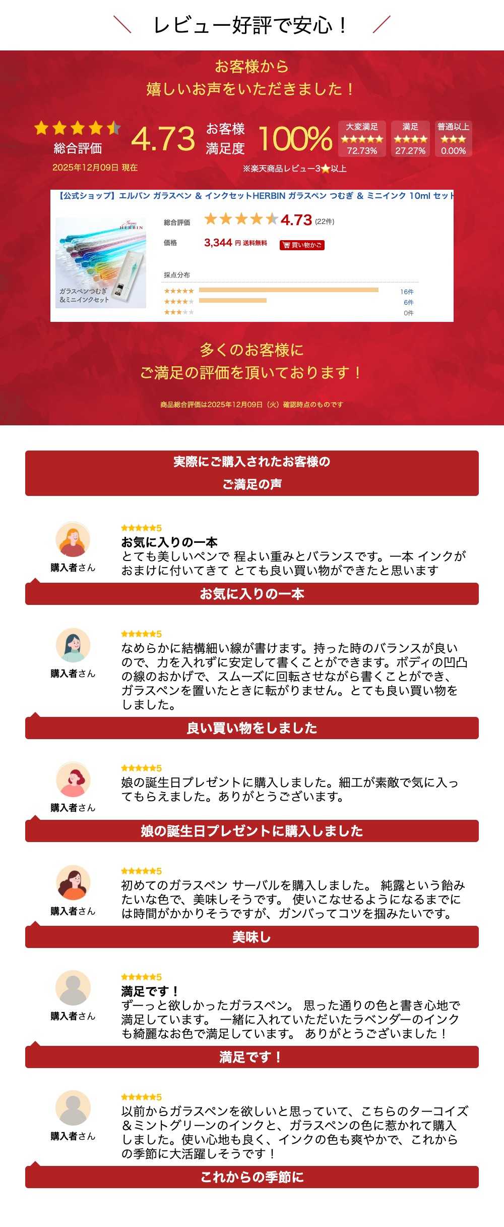 ギフトにも最適 ガラスペンと定番インクのセット ガラスペン「つむぎ」シリーズと、エルバンの定番インク「トラディショナルインク」のミニサイズを組み合わせたセット。ガラスペンは、すべてハンドクラフトによる1点物。 ニブ(ペン先)部分に施された細かな溝により、インク切れなく数行にわたり文字を書くことができます。 淡いカラーのボディと、なめらかならせんを描く繊細なペン先は、眺めるだけで涼しげです。 インクの量やペン先への力の入れ具合を調節しながら、インクの濃淡の変化を味わうのも楽しみの一つです。 ※1点1点手作りのため、色の透明度や柄、サイズなど、それぞれ若干異なります。予めご了承ください。 ブランド:エルバン ガラスペン サイズ:約20cm(ボディの長さ) トラディショナルインク 容量:10ml ガラスボトル入り ※ギフトにも最適な専用BOX入り 【ブランドロゴ変更のお知らせ】 ブランド「エルバン」に関しまして、ブランドロゴが下記のとおり変更になりました。 商品および商品パッケージのデザインにつきましては順次切り替えとなります。 メーカー希望小売価格はメーカーカタログに基づいて掲載しています 【フランスのステーショナリーを大切な方へ】 デザイン性に優れ、高級感のあるフランス文具は、大切な方への贈り物や感謝を伝える際にご使用いただくのに最適です。 ●気持ちを込めて ギフト プチギフト プレゼント 贈り物 手土産 御礼 お礼の品 お返し 引っ越し ご挨拶 転勤 転職 産休 ご褒美 手紙 お便り メッセージ グリーティング インビテーション ウェディングギフト ブライダルギフト 招待状 席札 ネームカード スタンプ 手作り ハンドメイド 封ろう 初心者 こだわり おしゃれ おもてなし DIY 高級感 アンティーク クラシカル オンリーワン サプライズ デコレーション デコ イニシャル クリスマスプレゼント 冬ギフト クリスマスギフト ホリデーギフト ラッピング ギフトラッピング セルフラッピング クリスマスラッピング ラッピングBOX ラッピングボックス ●大切なイベントに クリスマスプレゼント 誕生日 バースデー お歳暮 お年賀 バレンタインデー ホワイトデー 卒業祝い 入学祝い 母の日 父の日 こどもの日 お中元 夏ギフト 敬老の日 ハロウィン 同窓会 ウェディング ブライダル セレモニー パーティ ホリデー 卒業記念 記念品 引退 ミニギフト おめでとう ●お祝い事などに 出産祝い 結婚祝い 内祝 引き出物 就職祝い 昇進祝い 退職祝い 還暦祝い 新築祝い 結婚式 披露宴 引出物 金婚式 銀婚式 男性向け 女性向け 中学生 高校生 大学生 文房具関連商品【公式ショップ】 エルバン ガラスペン インクセット ボンボン HER...【公式ショップ】エルバン Parisカラーズ ガラスペンつむぎ & ミ...【公式ショップ】エルバン 星の王子さま ガラスペン つむぎ & ミニイ...3,344円3,432円4,950円【公式ショップ】エルバン ガラスペン らせん&ミニインクセット 専用箱...【公式ショップ】 ガラスペン つむぎ エルバン A5水彩紙プレゼント中...【公式ショップ】 カリグラフィー&ライティングセット ニブ6種&木製ペ...3,080円3,300円3,080円【公式ショップ】 生誕350年 フランスのインクとシーリングワックス ...【公式ショップ】エルバン ガラスペン らせん A5水彩紙プレゼント中 ...【公式ショップ】インク ジャックエルバン アニバーサリーインク 167...3,300円2,376円3,520円【公式ショップ】ジャックエルバン アニバーサリーインク 1798 イン...【公式ショップ】 ガラスペン ボンボン ハンドメイド 【生誕350年 ...【公式ショップ】 ジャックエルバン アーティストクリエーション -Sh...3,520円2,640円3,234円これからガラスペンを始めてみたいという、ガラスペン初心者にオススメのエルバン ガラスペン つむぎ&トラディショナルインク ミニ(10ml)セット。エルバンのガラスペン「つむぎ」と、 各カラーに合ったオススメのインクが組み合わされたオススメのセットです。 〜ガラスペンの使い方〜 STEP 1.準備するもの ガラスペン ボトルインク 紙 ティッシュ コップ STEP 2.インクをつける インク瓶にガラスペンが当たらないように、上から垂直にガラスペンのペン先をインクに落とします。 溝の 2/3 くらいまでで大丈夫です。インクが多いときはフチで軽く振るい落とします。 STEP 3.書いてみる ガラスペンは溝に溜まったインクを使って書くので、 用紙に対して45〜60度くらいの角度にするとスムーズ。 インクの出て合わせて、少しずつ軸を回転させながら書きます。 〜ガラスペンの洗い方〜 STEP 1.ティッシュや柔らかい布でペン先のインクをやさしく拭き取ります。 STEP 2.水を入れたコップの中央にペン先を浸し、ゆっくり回すようにインクを落とします。 STEP 3.インクが落ちたら、ティッシュで水気を拭き取ります。 《ガラスペンでの作品作りにもピッタリな水彩紙「アクアパッド」プレゼント中!》 ガラスペンの魅力は、文字を書くだけでなく、絵を描けること。そんなガラスペンの魅力を存分に楽しめる、