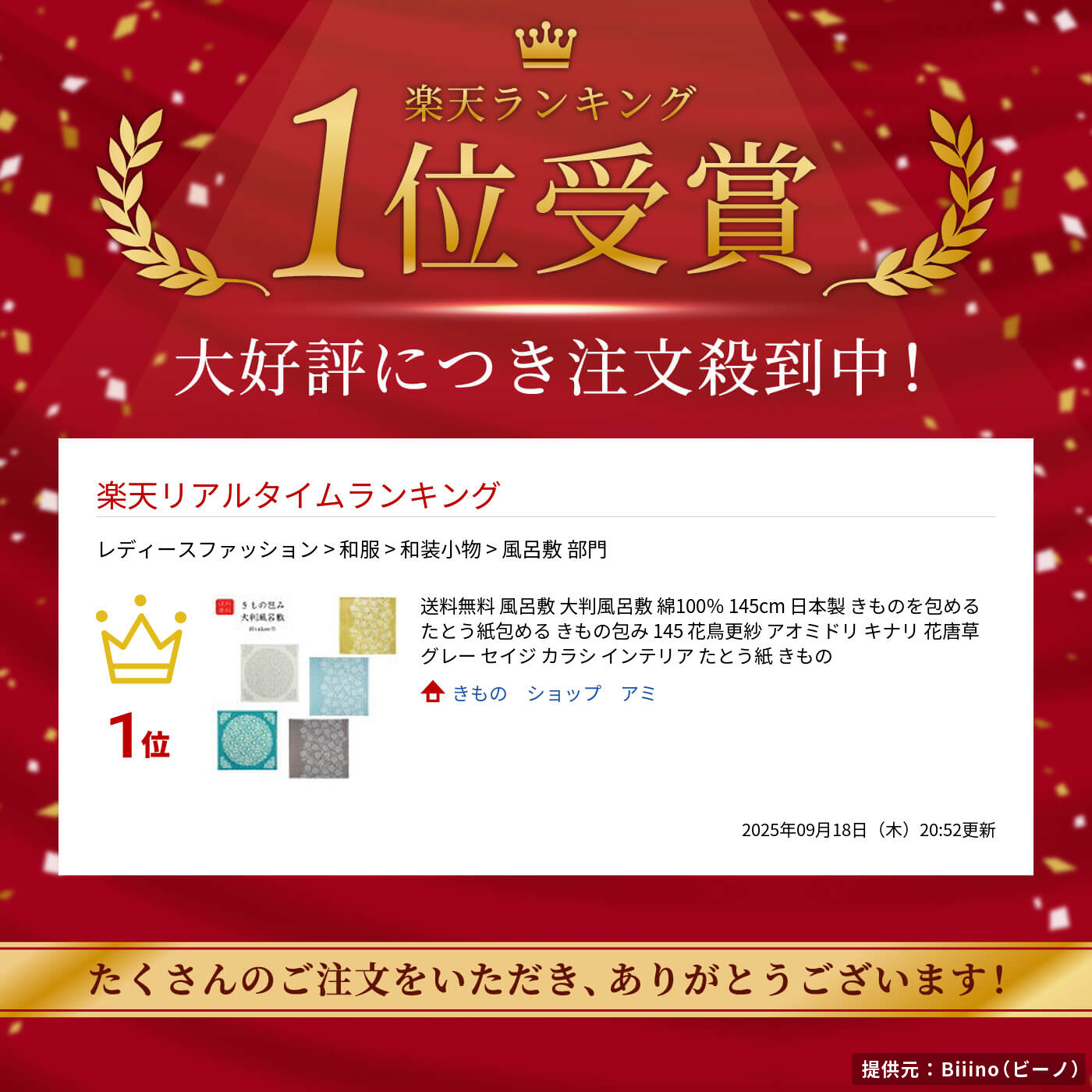 美しいデザインが特徴の大判風呂敷は、綿100%で日本製の高品質な商品です。150cmの大きさで、きものやたとう紙を包むのに最適です。花鳥更紗と唐草模様の2タイプがあり、手描き感のあるタッチが現代的な親しみを感じさせます。和の伝統をアレンジしたデザインは、インテリアとしても活用でき、日常に彩りを添えます。 サイズ縦 145cm × 横 145cm素材綿100%…特徴たとう紙ごと包める大判風呂敷注意事項■素材の特性上、お洗濯やクリーニングにより多少の縮みやねじれが生じる場合もございます。 ■商品の撮影には最大限注意を払っておりますが、閲覧時のモニター環境によりましては実際の商品と若干違うお色味に映ることもございます。美しいデザインが特徴の大判風呂敷は、綿100%で日本製の高品質な商品です。145cmの大きさで、きものやたとう紙を包むのに最適です。花鳥更紗と唐草模様の2タイプがあり、手描き感のあるタッチが現代的な親しみを感じさせます。和の伝統をアレンジしたデザインは、インテリアとしても活用でき、日常に彩りを添えます。美しいデザインが特徴の大判風呂敷は、綿100%で日本製の高品質な商品です。145cmの大きさで、きものやたとう紙を包むのに最適です。花鳥更紗と唐草模様の2タイプがあり、手描き感のあるタッチが現代的な親しみを感じさせます。和の伝統をアレンジしたデザインは、インテリアとしても活用でき、日常に彩りを添えます。美しいデザインが特徴の大判風呂敷は、綿100%で日本製の高品質な商品です。145cmの大きさで、きものやたとう紙を包むのに最適です。花鳥更紗と唐草模様の2タイプがあり、手描き感のあるタッチが現代的な親しみを感じさせます。和の伝統をアレンジしたデザインは、インテリアとしても活用でき、日常に彩りを添えます。