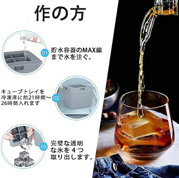 透明度がスゴイ→水晶のような透き通る透明感!消えてしまうほど透明な氷は、自然界で見られる凍結プロセスを模倣することで、蛇口をひねるのと同じくらい簡単に透明な氷を作ることができます。 透明なアイス キューブ型を使用すると、どの冷凍庫でも通常の水道水から完全に透明な氷を作ることができます。 トレイに水を入れて 18 〜 22 時間凍らせるだけで、大きな透明な立方体が 4 つできます。 当社の氷は溶けるのが遅いため、飲み物の希釈が少なくなり、凍結プロセスにより自然に氷が浄化され、優れた味が得られます。 透明氷メーカーで自宅でも最高の味を!高純度&長持ちする丸氷で家飲みが一瞬で高級バーの雰囲気に! 様々なドリンクに使って、より美しく、より楽しく!ドリンクだけでなく、直径7.0cmと大きいのでフラワーアイスキューブにもぴっ透明度が高いので、花の形も色も美しく映えます。 ギフトにも最適: シンプルで上品なデザインのボックスに入っています。説明書も付属していますのでギフトにも最適。 ▼ ※こちらの対応と商品について何かご不満がありましたら、「レビュー」を付ける前に一度ショップとご連絡してお願いいたします、ショップの誠意を持って最後まで対応させていただきます。 ※商品には多少の個体差がございます。予めご了承くださいませ。 ※発送途中で箱が潰れる可能性があります。ご理解お願いします。 ※PC環境・光の具合により、色や素材のイメージが写真と若干異なる場合がございます。 ※モデル・写真に使用されているアクセサリー・小物は別途記載が無い限り付属いたしません。 ※商品のお色はお客様のPC環境によって多少色合い、見え方など違ってまいりますのでご了承下さいますようお願いします。 ※写真の色調はご使用のモニターの機種や設定により実際の商品と異なる場合があります。 ※商品のサイズは、全て平置きにて外寸を測定しております。 ※商品によっては±1cm〜3cmの誤差が発生してしまう場合がございます。予めご理解いただきますようお願い致します。 ※該当商品は他店と在庫共有です。タイミングにより、在庫ズレが生じる場合がございます。予めご了承ください。 ※パッケージは改良のため予告なく仕様を変更する場合があります、ご理解いただきますようお願い致します。