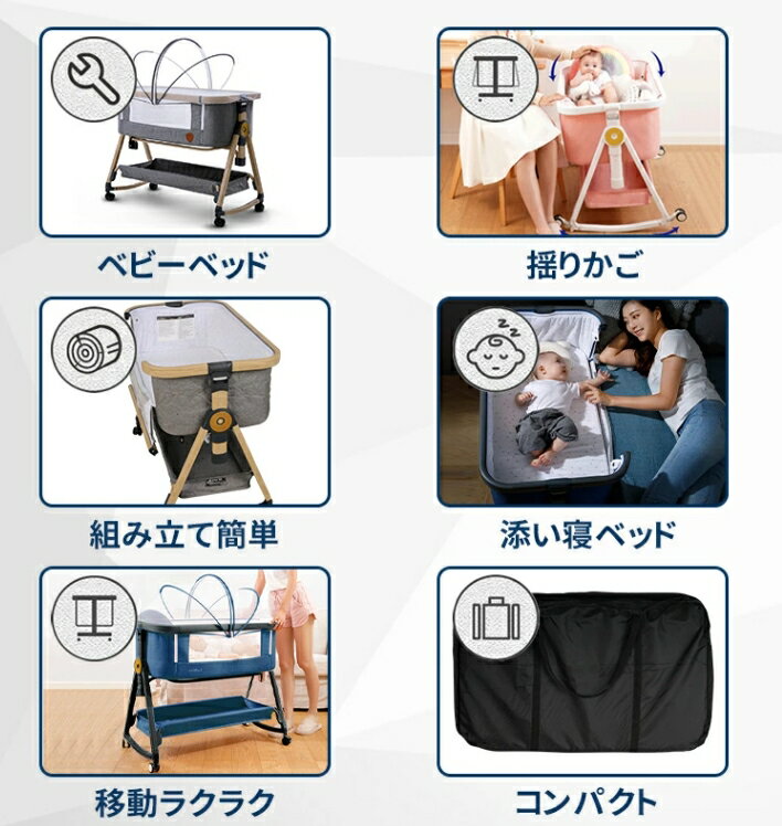 【商品詳細】 対象:0ヶ月〜24ヶ月 素材:高炭素鋼+綿 展開サイズ:92×54×82cm 収納:92×54×15cm 重さ:8kg ベビーベッド/添い寝、大人ベッドの高さ同じに調節できるし、固定ベルトつき、各高度の大人ベッドにくっつけてご利用可能です。下に収納かごつき、布団とおもちゃなどを入れて簡単に収納できます。 【高さ多段調節】高さ6段階調節可能で、各高度の大人ベッドにくっつけてご利用可能です。静音式のボタン設計で、自由に高さ調節し、お子様は振動を感じしなく、驚かないです。ベッドは少し傾き、新生児に対してミルクの吐くことを防ぐことができます。 【折畳・水洗い可能】組立不要で簡単に組み立てが出来ます。コンパクトに折畳み可能で、場所を取りません。ご自宅でカバーのお洗濯が可能です。赤ちゃんの肌にも直接触れるものですのでいつでも清潔にします。