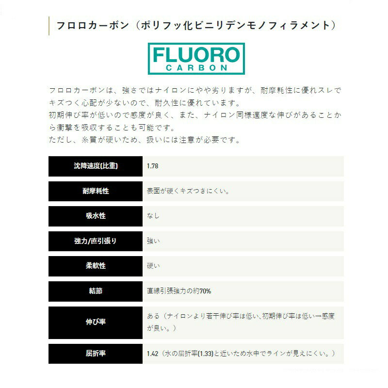 商品説明硬さを突き詰めた先にあったのは「スレを弾く(はじく)」という新世界。抜群の実釣強さが、その一尾を逃さない。「プラズマライズ」により、フロロカーボンの表面にガラスのような硬いポリマー層を形成。スレを弾いてキズ自体を寄せ付けないほどの強靭さは、根ズレなどハードな外的要因が絡む場所で抜群の実釣強さを発揮します。◆技術紹介◎ノンストレススプーリングスプーリング時に糸に負担をかけない糸巻方法。ノンテンションで巻き上げることにより、 糸の特性を最大限に生かすノンストレス方法採用。伸縮性が重要視されるへら釣りラインや細号柄の渓流・鮎用ラインには特に抜群の性能を発揮します。※NSSラインご使用時の注意点NSS仕上げはソフトな巻き状態となっているため、ご使用方法によってはスプールの中でライン同士が食い込み、ラインが取り出せなくなる場合があります。NSSを十分に活かすため、ご使用時には以下の点にご注意ください。【道糸をリールに巻く場合】スプールの回転を押さえる力を調整し、ラインが食い込まないテンションでリールに巻いてください。【ハリスを使用する場合】糸グセを取るときはスプールを持ってラインを伸ばさず、必ずカットしてから伸ばしてください。◎Plasma Rise(プラズマライズ)(株)プラズマコンセプト東京との共同開発により、これまで困難と言われてきた、繊維状物質の大気圧プラズマ連続処理を世界で初めて実現。 これにより釣糸へのプラズマ処理が可能となり、様々な性能を付与することが可能となりました。釣り人たちのストイックな要求に応えうる、無限の可能性を秘めた革新的テクノロジーです。◆フロロカーボン(ポリフッ化ビニリデンモノフィラメント)フロロカーボンは、強さではナイロンにやや劣りますが、耐摩耗性に優れスレでキズつく心配が少ないので、耐久性に優れています。初期伸び率が低いので感度が良く、また、ナイロン同様適度な伸びがあることから衝撃を吸収することも可能です。ただし、糸質が硬いため、扱いには注意が必要です。◎沈降速度(比重):1.78◎耐摩耗性:表面が硬くキズつきにくい。◎吸水性:なし◎強力/直引張り:強い◎柔軟性:硬い◎結節:直線引張強力の約70%◎伸び率:ある(ナイロンより若干伸び率は低い、初期伸び率は低い→感度が良い。)◎屈折率:1.42(水の屈折率(1.33)と近いため水中でラインが見えにくい。)SUNLINE サンライン トルネード Vハード 50m ●素材:フロロカーボンライン●COLOR:ナチュラルクリア/50m巻単品●号数:1.5号詳細はこちら