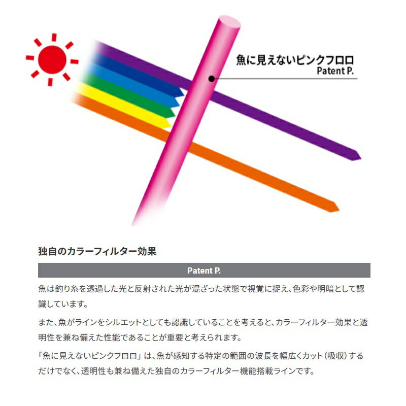 商品説明■高分子量フロロカーボン100%人に見やすく魚に見えない、あらゆる魚種の釣果アップ!!大物が釣れる!唯一の魚に見えないピンクフロロ Patent P.より大物に対応可能な50号〜120号を新たにラインナップ!!科学的な根拠と膨大な実釣検証により誕生したピンクフロロは、特殊配合による 「カラーフィルター効果 Patent P.」 で魚が感知する波長をカットし 「魚に見えない」 を実現。■人に見やすく魚に見えにくい 「ステルスピンク」 採用。一般的なピンクラインより幅広く 魚に見えない色相領域をカバー Patent P.■高分子量フロロカーボン原料を採用し、柔軟性があり粘り強い■巻き癖の付きにくい大判スプール採用※50〜120号はカセ巻き(スプール無し)となります。■独自のカラーフィルター効果魚は釣り糸を透過した光と反射された光が混ざった状態で視覚に捉え、色彩や明暗として認識しています。また、魚がラインをシルエットとしても認識していることを考えると、カラーフィルター効果と透明性を兼ね備えた性能であることが重要と考えられます。「魚に見えないピンクフロロ」 は、魚が感知する特定の範囲の波長を幅広くカット(吸収)するだけでなく、透明性も兼ね備えた独自のカラーフィルター機能搭載ラインです。■「魚に見えないピンクフロロ」 だから可能となる見えない理由「魚に見えないピンクフロロ」 は一般のピンクラインと比べ、魚が感知する波長範囲を幅広くカットすることにより人の目にはピンクの色のままで見やすく、魚に対しては独自のカラーフィルター効果で 「魚に見えない」 ラインを実現しました。そのため、特にスレた魚や大物に対して絶大な効果を発揮するのは勿論の事、あらゆる魚種に対して釣果アップ!!DUEL Pink Fluorocarbon FISH CANNOT SEEデュエル 魚に見えないピンクフロロ 船ハリス大物●サイズ(号):60●標準強力(Lbs.):170●標準強力(kg):80●標準直径(mm):1.280●巻量(m):50●カラー:ステルスピンク詳細はこちら