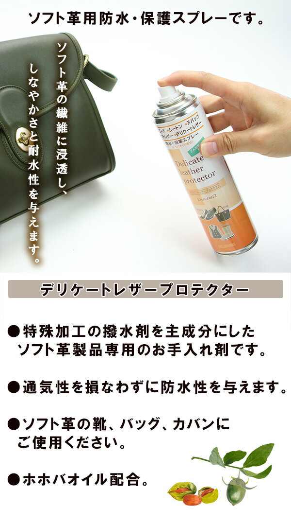 【使用上の注意】 ●必ず風通しのよい屋外でご使用ください。 ●お子さまの手の届かないところに保管してください。 万一飲み込んだ場合は水を飲ませるなどの応急処置をし、医師にご相談ください。 ●認知症の方などの誤飲を防ぐため、置き場所に注意してください。 MADE IN JAPAN JANコード / 4971671187283ホホバオイル配合 ソフト革の繊維に浸透し、しなやかさと耐水性を与える防水・保護スプレーです。 スエード、ムートン、ヌバック、ソフトレザー、デリケートレザーに。 280mL ■商品詳細 ●特殊加工の撥水剤を主成分にしたソフト革製品専用のお手入れ剤です。 ●通気性を損なわずに防水性を与えます。 ●ソフト革の靴、バッグ、カバンにご使用ください。