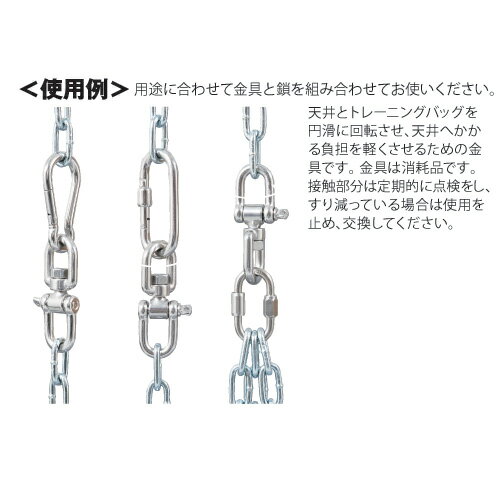 サンドバッグ用オプションアイテム 天井とトレーニングバッグの中間につなぎ、トレーニングバッグを円滑に回転させることにより、天井へかかる負担を軽減。 用途に合わせてサンドバッグ金具と鎖を組み合わせてお使いください。 また、シャックルの緩み・擦り減りにご注意ください。 サイズ:7.8cm・太さ0.8cm 素材:ステンレス製 重量:95g 耐荷重量:600kg 販売の単位:個