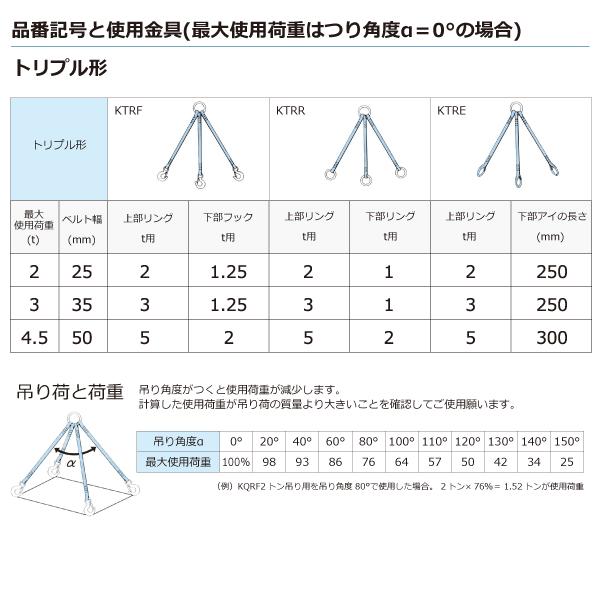 リング・フックを付けて用途拡大、スリング部分にはシグナルスリングを使用しています。3点吊り用 上部リング下部フックです。【仕様】・商品名:TORAY 金具付シグナルスリング KTRF トリプル形・先端形状:上部リング/下部フック・ベルトサイズ:幅35mm×長さ3m・最大使用荷重:3ton・ベルト素材:ポリエステル・用途:一般用・生産物賠償責任保険(PL保険)付・販売元:東レインターナショナル※使用荷重表をご確認いただき、余裕のある製品を選定してください。【用途】シライスリングは玉掛作業用繊維スリングのパイオニアとして、用途に合わせた豊富なラインアップをご用意しました。50年以上の豊富な経験と実績で、玉掛け作業の合理化と省力化に役立つと共に、点検の容易さがスリングの安全性を確保しています。【安全上のご注意】1、先端形状の上部下部の種類や吊り角度により使用荷重が減少します。2、使用方法・使用荷重を考慮し、余裕のある製品を選定してください。3、角張った吊り荷は補強筒を使用、100℃以下で使用、強酸等化学薬品は使用禁止です。4、玉掛け作業は労働安全衛生法に定められた有資格者が行ってください。5、付属の説明書をいつでも読めるように保管し、熟読してからご使用ください。