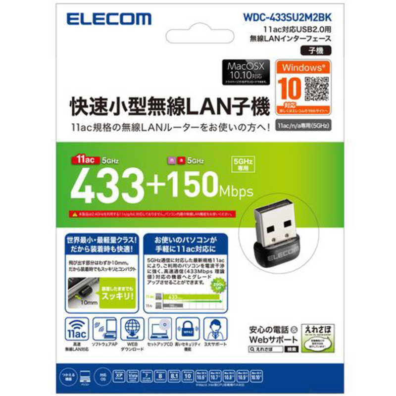 【商品解説】●5GHz通信で電波干渉に強く、11acにより最大433Mbpsの超高速通信に対応しているため、手軽にパソコンをグレードアップすることが可能です。 ※11n/g/b (2.4GHz)通信には対応しません。11ac/n/a (5GHz)対応の無線LANルーターと組み合わせてご利用ください。●世界最小・最軽量クラス( ※)で、パソコン装着時の飛び出し範囲はたった10mm。だから、ノートパソコンに挿したまま持ち運んでも気になりません。( ※2015年6月25日現在 当社調べ)●インターネットがない環境では付属のCD-ROMから、CD-ROMドライブのないUltrabookTMでは弊社WEBからのダウンロードとご利用環境に応じてドライバーのインストール方法が選択可能。 ※有線LANまたはパソコン内蔵の無線子機によりインターネットに接続できる環境が必要です。【スペック】●型式:WDC-433SU2M2BK(WDC433SU2M2BK)●JANコード:4953103473003本体サイズ(幅×高さ×奥行)mm:約19×8×15本体重量:約2g無線規格名称:Wi-Fi 5(ac)無線通信速度:最大433MbpsメッシュWifi:メッシュWifi非対応外付けドライブ用USB対応:-LANポート規格:無ビームフォーミング機能:ビームフォーミング機能なしワンタッチ接続機能:ワンタッチ接続機能ありセキュリティ規格:WPA2対応OS:10S(32/64bit)/10(32/64bit)/8.1(32/64bit)/8(32/64bit)/7SP1以降(32/64bit)/VistaSP2以降(32bit)/XPSP3以降、MacOSX10.10/10.9/10.8/10.7/10.6※Windows10Sはドライバレス対応対応機種:WindowsPC MacPC付属品:かんたんセットアップガイド CD-ROM(ドライバーソフト)仕様1:【データ転送速度】【伝送速度(理論値)】最大433Mbps◆【詳細】【注意事項】はメーカーホームページをご確認ください。仕様2:【セキュリティー】WPA2-PSK(AES)、WPA-PSK(TKIP)、WEP(128/64bit)仕様3:【規格】【準拠規格】IEEE802.11ac (5GHz帯)、IEEE802.11n (5GHz帯)、IEEE802.11a (5GHz帯)この商品は宅配便でお届けする商品です出荷可能日から最短日時でお届けします。※出荷完了次第メールをお送りします。配送サービス提供エリアを調べることができます「エリア検索」をクリックして、表示された画面にお届け先の郵便番号7桁を入力してください。ご購入可能エリア検索お買い上げ合計3,980円以上で送料無料となります。※3,980円未満の場合は、一律550円(税込)となります。●出荷可能日から最短日時でお届けします。(日時指定は出来ません。) ※お届け時に不在だった場合は、「ご不在連絡票」が投函されます。 「ご不在連絡票」に記載された宅配業者の連絡先へ、再配達のご依頼をお願いいたします。●お届けは玄関先までとなります。●宅配便でお届けする商品をご購入の場合、不用品リサイクル回収はお受けしておりません。●全て揃い次第の出荷となりますので、2種類以上、または2個以上でのご注文の場合、出荷が遅れる場合があります。詳細はこちら■商品のお届けについて商品の到着日については、出荷完了メール内のリンク(宅配業者お荷物お問い合わせサービス)にてご確認ください。詳しいお届け目安を確認する1度の注文で複数の配送先にお届けすることは出来ません。※注文時に「複数の送付先に送る」で2箇所以上への配送先を設定した場合、すべてキャンセルとさせていただきます。