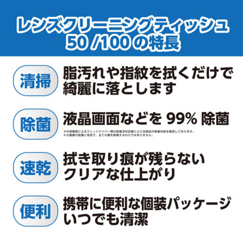 【商品解説】拭き取り跡が残りにくく除菌もできるウェットティッシュレンズクリーニングティッシュ50は、拭き取り痕が残らないクリアな仕上がりが特徴です。レンズや液晶画面などの脂汚れや指紋を、さっと拭くだけで綺麗に落とします。携帯に便利で常に清潔な、使い捨て個装パッケージになっています。体に触れる箇所を清潔に保つ99%以上の除菌力液晶画面やファインダーなど体の触れる部分を清潔に保つ、除菌率99%以上のクリーニングティッシュです。外部機関によるウェットワイパー類の除菌活性試験により、除菌性能を確認済みです。※大腸菌の除菌に有効で、全ての菌を除菌するわけではありません。繊細なレンズにも使えるパルプ100%のソフト素材クリーニングリキッドで湿らせたパルプ100%の柔らかい素材で、傷付きやすいレンズ等への使用も安心です。レンズ面を清掃する場合は、クリーニング面の中心から外側に向けて円を描くように軽く拭くことで、拭き残りなくクリアに仕上がります。タブレットやスマートフォンの液晶画面の清掃にも最適レンズやカメラだけでなく、タブレットや「トイレよりも汚い」と言われることもあるスマートフォンの画面清掃にも最適です。トイレなどで付着しやすい大腸菌にも効果的な、アルコールタイプのウェットティッシュで画面を清潔に保てます。大きな画面でも効率的に清掃できるペーパーサイズタブレットなどの液晶画面もストレスなく清掃できる、大きめペーパーサイズ(120×160mm)です。いつでも清潔な1枚ずつの個別包装1枚ずつの個装パックなので、いつでも清潔に使えます。バッグのポケットなどに収納して持ち歩き易い小型サイズです。【スペック】●型式:KMC-77(KMC77)●JANコード:4977187329759仕様1:■枚数 : 50枚入り■ペーパーサイズ : 約120×160mm■成分 : アルコール類、水■材質 : パルプ100%この商品は宅配便でお届けする商品です出荷可能日から最短日時でお届けします。※出荷完了次第メールをお送りします。配送サービス提供エリアを調べることができます「エリア検索」をクリックして、表示された画面にお届け先の郵便番号7桁を入力してください。ご購入可能エリア検索お買い上げ合計3,980円以上で送料無料となります。※3,980円未満の場合は、一律550円(税込)となります。●出荷可能日から最短日時でお届けします。(日時指定は出来ません。) ※お届け時に不在だった場合は、「ご不在連絡票」が投函されます。 「ご不在連絡票」に記載された宅配業者の連絡先へ、再配達のご依頼をお願いいたします。●お届けは玄関先までとなります。●宅配便でお届けする商品をご購入の場合、不用品リサイクル回収はお受けしておりません。●全て揃い次第の出荷となりますので、2種類以上、または2個以上でのご注文の場合、出荷が遅れる場合があります。詳細はこちら■商品のお届けについて商品の到着日については、出荷完了メール内のリンク(宅配業者お荷物お問い合わせサービス)にてご確認ください。詳しいお届け目安を確認する1度の注文で複数の配送先にお届けすることは出来ません。※注文時に「複数の送付先に送る」で2箇所以上への配送先を設定した場合、すべてキャンセルとさせていただきます。