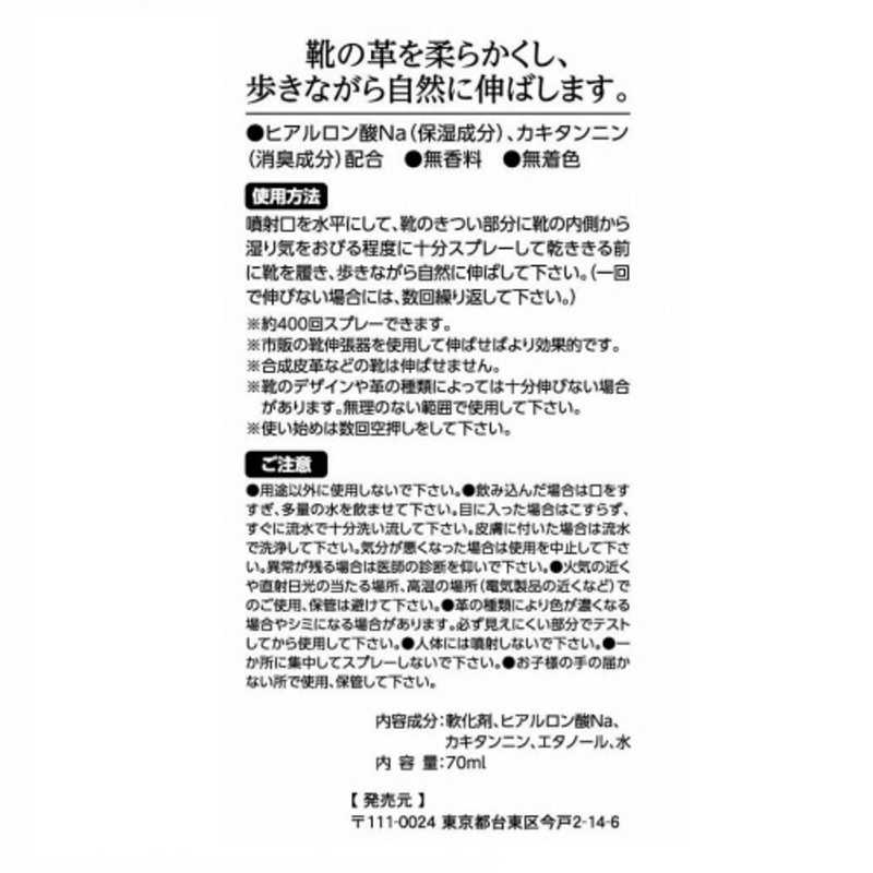 【商品解説】当たってキツイ靴に!消臭成分を配合したノンガスタイプの革伸ばしスプレー●簡単便利!スプレーして歩くだけ!当たってキツイ部分に靴の内側からスプレーして歩くだけで、徐々に革を伸ばします。●嬉しい消臭成分配合消臭成分のカキタンニンを配合し、消臭効果をプラス。更にノンガスタイプなので場所を選ばずに使用できます。●使用方法噴射口を水平にして、靴のキツイ部分に内側から湿り気を帯びる程度にスプレーして下さい。その後、乾ききらない前に靴を履き、歩きながら自然に伸ばして下さい。※市販の靴伸張器と併用しますとより効果的です。●容量: 30ml【スペック】●型式:(SRWLS)●JANコード:4906257005606この商品は宅配便でお届けする商品です出荷可能日から最短日時でお届けします。※出荷完了次第メールをお送りします。配送サービス提供エリアを調べることができます「エリア検索」をクリックして、表示された画面にお届け先の郵便番号7桁を入力してください。ご購入可能エリア検索お買い上げ合計3,980円以上で送料無料となります。※3,980円未満の場合は、一律550円(税込)となります。●出荷可能日から最短日時でお届けします。(日時指定は出来ません。) ※お届け時に不在だった場合は、「ご不在連絡票」が投函されます。 「ご不在連絡票」に記載された宅配業者の連絡先へ、再配達のご依頼をお願いいたします。●お届けは玄関先までとなります。●宅配便でお届けする商品をご購入の場合、不用品リサイクル回収はお受けしておりません。●全て揃い次第の出荷となりますので、2種類以上、または2個以上でのご注文の場合、出荷が遅れる場合があります。詳細はこちら■商品のお届けについて商品の到着日については、出荷完了メール内のリンク(宅配業者お荷物お問い合わせサービス)にてご確認ください。詳しいお届け目安を確認する1度の注文で複数の配送先にお届けすることは出来ません。※注文時に「複数の送付先に送る」で2箇所以上への配送先を設定した場合、すべてキャンセルとさせていただきます。