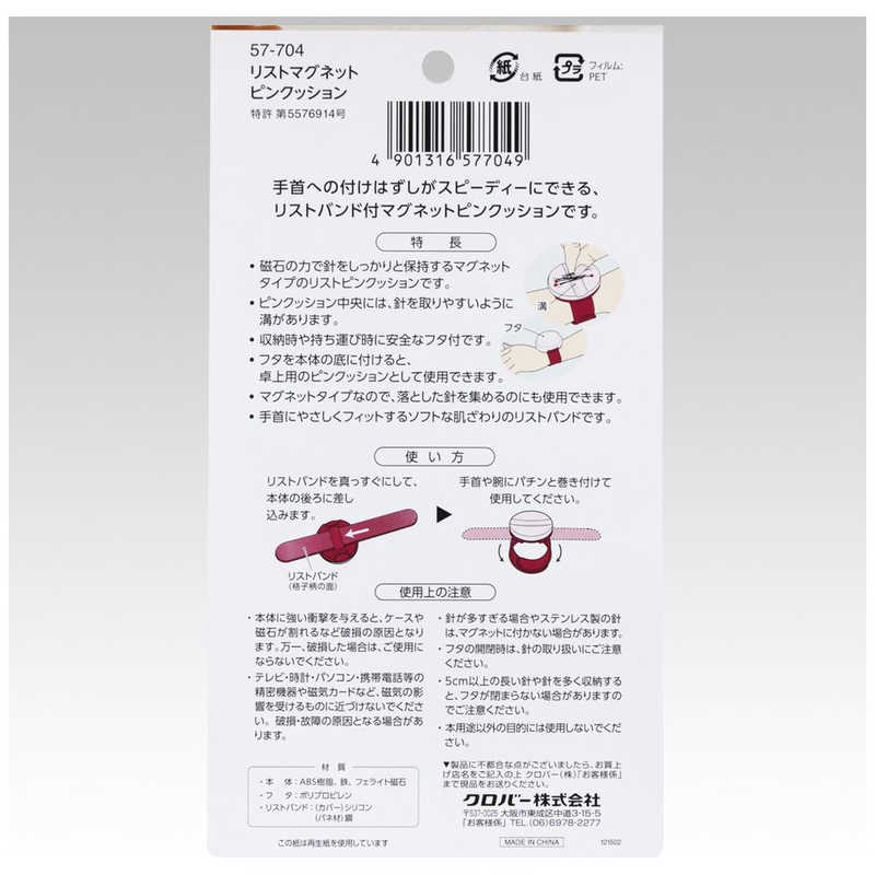 【商品解説】●マグネットタイプ・磁石の力で針をしっかりと保持するので、針ひろいにも使えます。●針が取りやすい溝付きです。●手首にやさしくフィット・シリコン製で、ソフトなリストバンドです。●収納や持ち運びに安全なフタ付です。●卓上型のマグネットピンクッションとしても!【スペック】●型式:57-704(57-704)●JANコード:4901316577049仕様1:素材: 本体/ABS樹脂、鉄、フェライト磁石 フタ/ポリプロピレン リストバンド/(カバー)シリコン(バネ材)鋼仕様3:規格・サイズ: 68×59×26この商品は宅配便でお届けする商品です出荷可能日から最短日時でお届けします。※出荷完了次第メールをお送りします。配送サービス提供エリアを調べることができます「エリア検索」をクリックして、表示された画面にお届け先の郵便番号7桁を入力してください。ご購入可能エリア検索お買い上げ合計3,980円以上で送料無料となります。※3,980円未満の場合は、一律550円(税込)となります。●出荷可能日から最短日時でお届けします。(日時指定は出来ません。) ※お届け時に不在だった場合は、「ご不在連絡票」が投函されます。 「ご不在連絡票」に記載された宅配業者の連絡先へ、再配達のご依頼をお願いいたします。●お届けは玄関先までとなります。●宅配便でお届けする商品をご購入の場合、不用品リサイクル回収はお受けしておりません。●全て揃い次第の出荷となりますので、2種類以上、または2個以上でのご注文の場合、出荷が遅れる場合があります。詳細はこちら■商品のお届けについて商品の到着日については、出荷完了メール内のリンク(宅配業者お荷物お問い合わせサービス)にてご確認ください。詳しいお届け目安を確認する1度の注文で複数の配送先にお届けすることは出来ません。※注文時に「複数の送付先に送る」で2箇所以上への配送先を設定した場合、すべてキャンセルとさせていただきます。