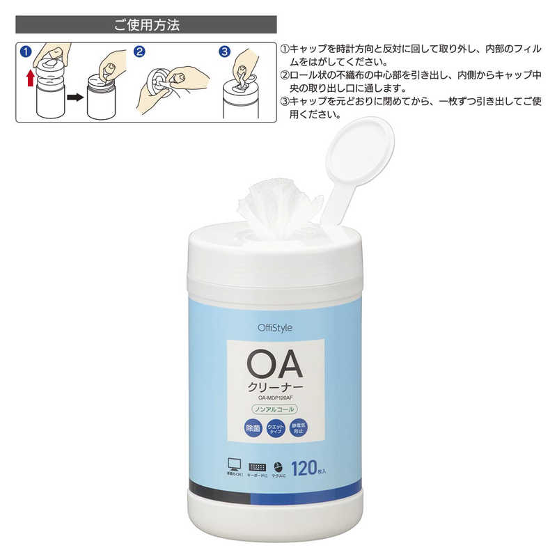 【商品解説】( 特 長 )● アルコール不使用だから、肌にも機器にもやさしい● ウェットタイプ● 静電気防止効果でホコリがつきにくい● キーボードやマウス、テレビやパソコンの液晶画面にも使えます( 仕 様 )● 主成分:精製水、界面活性剤、帯電防止剤、抗菌剤、防腐剤● 不織布サイズ:(約)横140×縦150mm● 枚数:120枚● 商品サイズ:(約)外径103×全長175mm● 質量:約478g(ご注意)※ OA専用クリーナーです。ブラウン管ディスプレイやプラズマテレビ、シャープモスアイパネルには使用しないでください。(表面のコーティングを傷つける場合があります。)【スペック】●型式:OA-MDP80BF(OAMDP80BF)●JANコード:4971275131569仕様1:[主成分]精製水、界面活性剤、帯電防止剤、抗菌剤、防腐剤[不織布サイズ]約 横140×縦150mm[枚数]120枚[商品サイズ]約 外径103×全長175mm[質量]約478g[ご注意]※OA専用クリーナーです。ブラウン管ディスプレイやプラズマテレビ、シャープモスアイパネルには使用しないでください。(表面のコーティングを傷つける場合があります。)この商品は宅配便でお届けする商品です出荷可能日から最短日時でお届けします。※出荷完了次第メールをお送りします。配送サービス提供エリアを調べることができます「エリア検索」をクリックして、表示された画面にお届け先の郵便番号7桁を入力してください。ご購入可能エリア検索お買い上げ合計3,980円以上で送料無料となります。※3,980円未満の場合は、一律550円(税込)となります。●出荷可能日から最短日時でお届けします。(日時指定は出来ません。) ※お届け時に不在だった場合は、「ご不在連絡票」が投函されます。 「ご不在連絡票」に記載された宅配業者の連絡先へ、再配達のご依頼をお願いいたします。●お届けは玄関先までとなります。●宅配便でお届けする商品をご購入の場合、不用品リサイクル回収はお受けしておりません。●全て揃い次第の出荷となりますので、2種類以上、または2個以上でのご注文の場合、出荷が遅れる場合があります。詳細はこちら■商品のお届けについて商品の到着日については、出荷完了メール内のリンク(宅配業者お荷物お問い合わせサービス)にてご確認ください。詳しいお届け目安を確認する1度の注文で複数の配送先にお届けすることは出来ません。※注文時に「複数の送付先に送る」で2箇所以上への配送先を設定した場合、すべてキャンセルとさせていただきます。