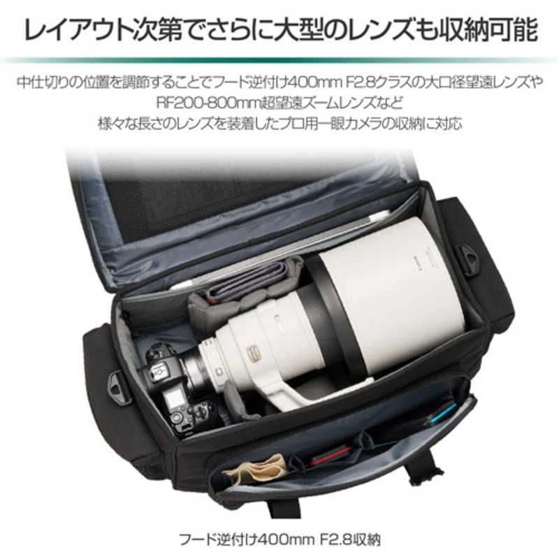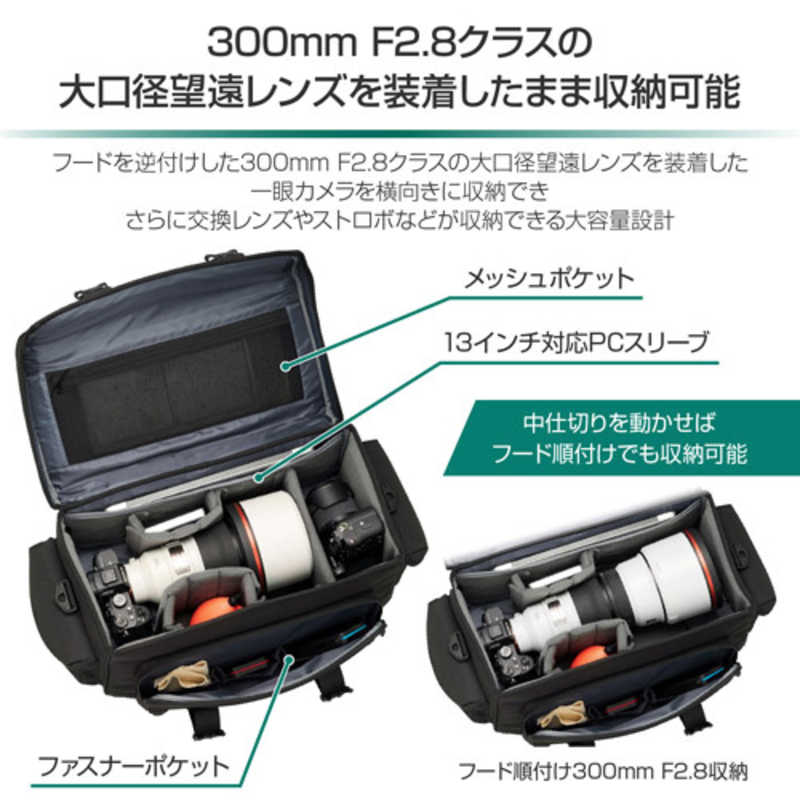 【商品解説】300mm F2.8クラスの大口径望遠レンズを装着したまま収納可能な大容量ショルダーバッグ収納スペースに無駄のないスクウェアデザインを採用した大型カメラバッグです。可変式の中仕切りにより多様な機材の収納に対応し、300mm F2.8クラスの大口径望遠レンズを装着した一眼カメラをそのまま横向きで収納できるほか、レンズ付きの一眼カメラを下向きに2台収納することも可能。一覧しやすい大きな開口部でカメラを素早く出し入れできます。【スペック】●型式:SGWSR-SB24(SGWSRSB24)●JANコード:4977187209075容量:20〜25L内寸(mm):カメラ収納部内寸法 : 約W440×H250×D220mmPC収納スペース内寸(mm):PC収納部参考収容寸法 : 約W400×H240×D15mm外寸(mm):外寸法 : 約W530×H285×D295mm本体重量:重量 : 約2390g付属品:付属品 : 中仕切り×12、三脚固定ベルト×2、ショルダーベルト材質:材質 : ポリエステル、ターポリン収納の目安:フードを逆付けした300mm F2.8クラスの大口径望遠レンズを装着した一眼カメラ仕様1:フードを逆付けした300mm F2.8クラスの大口径望遠レンズを装着した一眼カメラを横向きに収納でき、さらに交換レンズやストロボなどが収納できる大容量設計です。この商品は宅配便でお届けする商品です出荷可能日から最短日時でお届けします。※出荷完了次第メールをお送りします。配送サービス提供エリアを調べることができます「エリア検索」をクリックして、表示された画面にお届け先の郵便番号7桁を入力してください。ご購入可能エリア検索お買い上げ合計3,980円以上で送料無料となります。※3,980円未満の場合は、一律550円(税込)となります。●出荷可能日から最短日時でお届けします。(日時指定は出来ません。) ※お届け時に不在だった場合は、「ご不在連絡票」が投函されます。 「ご不在連絡票」に記載された宅配業者の連絡先へ、再配達のご依頼をお願いいたします。●お届けは玄関先までとなります。●宅配便でお届けする商品をご購入の場合、不用品リサイクル回収はお受けしておりません。●全て揃い次第の出荷となりますので、2種類以上、または2個以上でのご注文の場合、出荷が遅れる場合があります。詳細はこちら■商品のお届けについて商品の到着日については、出荷完了メール内のリンク(宅配業者お荷物お問い合わせサービス)にてご確認ください。詳しいお届け目安を確認する1度の注文で複数の配送先にお届けすることは出来ません。※注文時に「複数の送付先に送る」で2箇所以上への配送先を設定した場合、すべてキャンセルとさせていただきます。