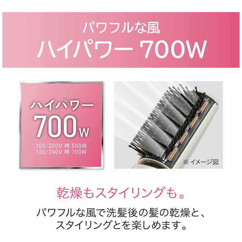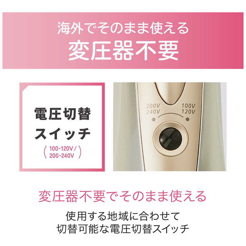 【商品解説】海外でいつもの仕上がり。ふんわりボリュームヘア ●変圧器不要 使用する地域に合わせて切替可能な電圧切替スイッチ。●先玉ボリュームキャッチブラシ 極細キャッチコームが、髪をしっかりキャッチ。根元から髪を逃さずボリュームアップ。●パワフルな風 ハイパワー700Wのパワフルな風で乾燥もスタイリングも。●ツインマイナスイオン マイナスイオン発生部を2箇所搭載。●毛髪巻き込み防止機構 モーター軸に毛髪が徐々に絡まることによる回転数低下を抑制します。●2段階温風切替 髪の乾燥にはHIGHモード、セットにLOWモード。 【仕様】・イオン発生: ツインマイナスイオン・電源: AC 100V・200V/120V・240V 50/60Hz共用・消費電力(約): [100V・200V]500W、[120V・240V]700W・安全装置: 温度ヒューズ 152℃・温風温度: [HIGH]約105℃、[LOW]約85℃、 [HIGH]約120℃、[LOW]約95℃・メインスイッチ: HIGH-LOW-OFF・風量調節: HIGH-LOW・コードの長さ: 約1.7m・サイズ: 約234(W)×51(D)×58(H)mm・質量: 約315g(本体のみ)・付属品: 先玉ボリュームキャッチブラシ【スペック】●型式:KDD-0053/N(KDD0053N)●JANコード:4981747079770この商品は宅配便でお届けする商品です出荷可能日から最短日時でお届けします。※出荷完了次第メールをお送りします。配送サービス提供エリアを調べることができます「エリア検索」をクリックして、表示された画面にお届け先の郵便番号7桁を入力してください。ご購入可能エリア検索お買い上げ合計3,980円以上で送料無料となります。※3,980円未満の場合は、一律550円(税込)となります。●出荷可能日から最短日時でお届けします。(日時指定は出来ません。) ※お届け時に不在だった場合は、「ご不在連絡票」が投函されます。 「ご不在連絡票」に記載された宅配業者の連絡先へ、再配達のご依頼をお願いいたします。●お届けは玄関先までとなります。●宅配便でお届けする商品をご購入の場合、不用品リサイクル回収はお受けしておりません。●全て揃い次第の出荷となりますので、2種類以上、または2個以上でのご注文の場合、出荷が遅れる場合があります。詳細はこちら■商品のお届けについて商品の到着日については、出荷完了メール内のリンク(宅配業者お荷物お問い合わせサービス)にてご確認ください。詳しいお届け目安を確認する1度の注文で複数の配送先にお届けすることは出来ません。※注文時に「複数の送付先に送る」で2箇所以上への配送先を設定した場合、すべてキャンセルとさせていただきます。