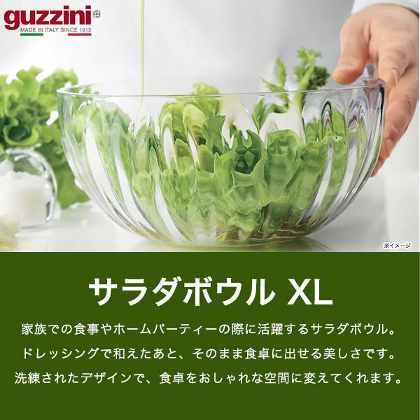 guzzini BELLE EPOQUE サラダボウル XL 直径30cm/容量4.5L(メーカー箱無し) 家族での食事やホームパーティーの際に活躍するサラダボウル。 ドレッシングで和えたあと、そのまま食卓に出せる美しさです。 洗練されたデザインで、食卓をおしゃれな空間に変えてくれます。 guzzini(グッチーニ)とは 1912年に創業したイタリアの高級キッチンブランド。 世界の有名デザイナーが商品デザインを手掛けており、 最先端技術を駆使し樹脂でありながらも、ガラスや磁器のような素材感を実現。 「限りなく透明に近いアクリル樹脂」を目指した樹脂プロダクトの最高品質です。 実用性と美しさを兼ね備えた製品は 洗練されたデザインが食卓のアクセントとなり、 華やかなパーティーシーンにもおすすめ。 軽くて割れにくいのでアウトドアやお子様が使用する際にも適しています。 ※本品には、メーカーの外装箱がありません。あらかじめご了承の上、お買い求めください。 製品仕様 メーカー guzzini(グッチーニ) 型番 290930 サイズ(約) 直径30×高さ12.4cm 重さ(約) 660g 容量(約) 4.5L 材質 AS樹脂 生産国 イタリア 注意 ※食器洗浄機:可 ※電子レンジ:不可 ※本品には、メーカーの外装箱がありません。あらかじめご了承の上、お買い求めください。guzzini BELLE EPOQUE サラダボウル XL 直径30cm/容量4.5L(メーカー箱無し) 家族での食事やホームパーティーの際に活躍するサラダボウル。 ドレッシングで和えたあと、そのまま食卓に出せる美しさです。 洗練されたデザインで、食卓をおしゃれな空間に変えてくれます。 guzzini(グッチーニ)とは 1912年に創業したイタリアの高級キッチンブランド。 世界の有名デザイナーが商品デザインを手掛けており、 最先端技術を駆使し樹脂でありながらも、ガラスや磁器のような素材感を実現。 「限りなく透明に近いアクリル樹脂」を目指した樹脂プロダクトの最高品質です。 実用性と美しさを兼ね備えた製品は 洗練されたデザインが食卓のアクセントとなり、 華やかなパーティーシーンにもおすすめ。 軽くて割れにくいのでアウトドアやお子様が使用する際にも適しています。 ※本品には、メーカーの外装箱がありません。あらかじめご了承の上、お買い求めください。 製品仕様 メーカー guzzini(グッチーニ) 型番 290930 サイズ(約) 直径30×高さ12.4cm 重さ(約) 660g 容量(約) 4.5L 材質 AS樹脂 生産国 イタリア 注意 ※食器洗浄機:可 ※電子レンジ:不可 ※本品には、メーカーの外装箱がありません。あらかじめご了承の上、お買い求めください。