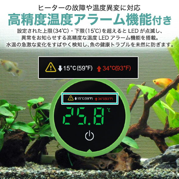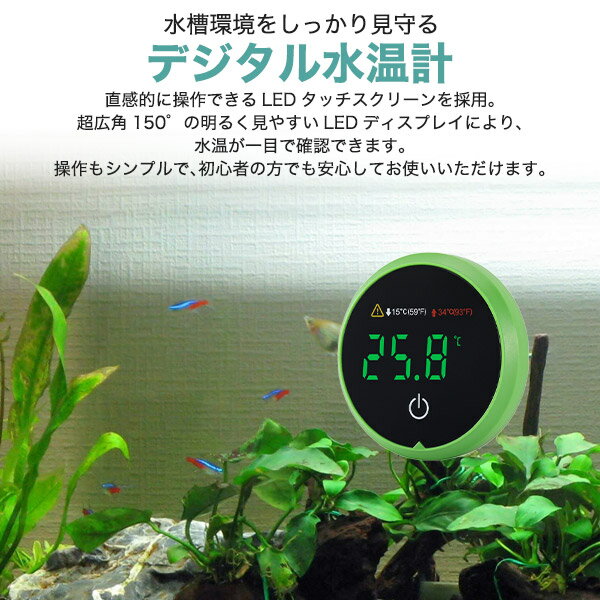 水槽環境をしっかり見守る! 水槽に貼るだけ!デジタル水温計 直感的に操作できるLEDタッチスクリーンを採用。 超広角150°の明るく見やすいLEDディスプレイにより、水温が一目で確認できます。 操作もシンプルで、初心者の方でも安心してお使いいただけます。 設定された上限(34℃)・下限(15℃)を超えるとLEDが点滅し、 異常をお知らせする高精度な温度LEDアラーム機能を搭載。 水温の急激な変化をすばやく検知し、魚の健康トラブルを未然に防ぎます。 特に温度に敏感な生体の飼育に最適です。 水槽の外側に貼るだけで簡単に設置可能! コードレス設計により配線が不要で、水槽の外観を損なわず、 正確な温度測定が可能です。防水仕様のセンサーを搭載しており、 淡水・海水どちらにも対応。あらゆる水槽レイアウトに柔軟に設置できます。 さらに、バックライト機能により暗い場所でも温度がはっきり表示され、 夜間でも視認性を確保。眩しすぎず適切な明るさを保ちます。 製品仕様 サイズ(約) 縦46×横48mm 重さ(約) 17g 対応サイズ ガラス・アクリルともに、厚み最大25mmまで対応 素材 ABS 温度測定範囲 -10~60℃ 温度アラーム範囲設定 上限34℃/下限15℃ 電源 CR2032電池×1個(テスト電池付属) 注意 ※設置場所を工夫し、正確に温度が測定できる位置に配置してください。 ※極端な高温環境や直射日光下での長時間使用は避けてください。 ※製品仕様は予告なく変更される場合があります。ご了承ください。水槽環境をしっかり見守る! 水槽に貼るだけ!デジタル水温計 直感的に操作できるLEDタッチスクリーンを採用。 超広角150°の明るく見やすいLEDディスプレイにより、水温が一目で確認できます。 操作もシンプルで、初心者の方でも安心してお使いいただけます。 設定された上限(34℃)・下限(15℃)を超えるとLEDが点滅し、 異常をお知らせする高精度な温度LEDアラーム機能を搭載。 水温の急激な変化をすばやく検知し、魚の健康トラブルを未然に防ぎます。 特に温度に敏感な生体の飼育に最適です。 水槽の外側に貼るだけで簡単に設置可能! コードレス設計により配線が不要で、水槽の外観を損なわず、 正確な温度測定が可能です。防水仕様のセンサーを搭載しており、 淡水・海水どちらにも対応。あらゆる水槽レイアウトに柔軟に設置できます。 さらに、バックライト機能により暗い場所でも温度がはっきり表示され、 夜間でも視認性を確保。眩しすぎず適切な明るさを保ちます。 製品仕様 サイズ(約) 縦46×横48mm 重さ(約) 17g 対応サイズ ガラス・アクリルともに、厚み最大25mmまで対応 素材 ABS 温度測定範囲 -10~60℃ 温度アラーム範囲設定 上限34℃/下限15℃ 電源 CR2032電池×1個(テスト電池付属) 注意 ※設置場所を工夫し、正確に温度が測定できる位置に配置してください。 ※極端な高温環境や直射日光下での長時間使用は避けてください。 ※製品仕様は予告なく変更される場合があります。ご了承ください。