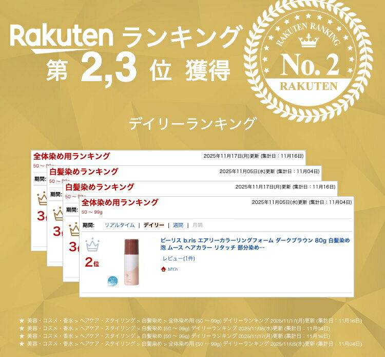 ビーリスの「エアリーカラーリングフォーム」は、泡タイプの白髪染めです! 【たった5分でしっかり染まる!】 Point.1 空気と反応して発色させ、髪の毛のキューティクルは開かずに染めるカラーファクト処方なので、髪の毛を痛めることなくしっかりと染め上げます。 また、空気で染める特殊製法のため、染毛特有の嫌な匂いも気になりません。 Point.2 たっぷりと配合された海藻の成分が、キューティクルをキュッとしめてカラーと潤いを閉じ込めます。 Point.3 特殊製法された「コラーゲン」が、ダメージを受けてヘタってしまった髪の毛に、ふんわりとしたボリューム感を与えます。 「脱色剤」「シリコン」「パラペン」「タール系色素」「紫外線吸収剤」は使用していないので、お肌に優しくお使いいただけます。 【名称】 ヘアカラーフォームTE ダークブラウン 【内容量】 80g 【使用方法】 容器(缶)を上下によく振ってお使いください。1.付属の手袋を装着し、適量を手にとり、乾いた髪の白髪が気になる部分から塗布します。2.髪を手で分けながら根元に揉み込むように、髪全体にしっかりとなじませます。3.5〜15分ほど放置します。※染まりにくい場合は放置時間をさらに5〜15分くらい長めにすることをおすすめします。4.ヘアカラーの色が出なくなるまですすぎ、シャンプーした後、リンスまたはコンディショナーで仕上げてよく乾かします。 【全成分】 <有効成分>塩酸2,4-ジアミノフェノキシエタノール、硫酸2,4-ジアミノフェノール、パラフェニレンジアミン、パラアミノフェノール、5-アミノオルトクレゾール、硫酸パラニトロメタフェニレンジアミン <その他の成分>グリチルリチン酸ジカリウム、ボタンエキス、コンフリーエキス、加水分解ケラチン液、加水分解シルク液、加水分解コラーゲン液、海藻エキス(1)、シア脂、L-アルギニン、1,3-ブチレングリコール、セトステアリルアルコール、パルミチン酸セチル、パルミチン酸2-エチルヘキシル、ポリエチレングリコール600、塩化セチルトリメチルアンモニウム、ポリオキシエチレンヤシ油脂肪酸ソルビタン(20E.O.)、ポリオキシエチレンセチルエーテル、ポリオキシエチレンベヘニルエーテル、亜硫酸ナトリウム(無水)、L-システイン塩酸塩、エデト酸塩、無水エタノール、香料、粘度調整剤、pH調整剤、モノエタノールアミン、精製水、LPG 【保存方法】 直射日光や高温多湿を避け、お子さまの手の届かない所に保管してください。 【ご使用上の注意】 ●傷、湿疹等、お肌に異常のある時は使用しないでください。●お肌に異常が生じていないかよく注意して使用してください。使用中、赤み、かゆみ、刺激、色抜け(白斑等)や黒ずみ等の異常が出た場合、また日光があたって同じような異常が出た場合は、使用を中止して、皮膚科専門医等にご相談されることをおすすめします。●目に入ったときは、直ちに洗い流してください。 【広告文責】 株式会社MY.h 050-1808-0077 【発売元】 b.ris 【原産国】 日本 【商品区分】 医薬部外品 【ご案内】 ●メーカーの都合により事前の告知なく商品パッケージが変更される場合もあり、商品画像と実際にお届けする商品のパッケージ等が異なる場合がございます。●当社では複数店舗を運営し他店舗でも販売しております為、ご注文後に品切れのご案内をさせていただく場合がございます。あらかじめご了承下さいますようお願い致します。 ……お得なセット商品のご案内…… 1個 2個セット 3個セット 関連商品シロジャム Sirojam ハンドセラム 25g クロコス ハンドク...【 2個セット 】 ビーリス b.ris エアリーカラーリングフォーム...【 3個セット 】 ビーリス b.ris エアリーカラーリングフォーム...4,380円7,960円11,640円リアラスター LIALUSTER レチノールディープクレンザー 110...シルクリスタ SILKRYSTA モイスチャーセラミックファンデーショ...ととのうぐらす 40g ファンファレ オールインワン ジェル ホワイト...3,960円4,180円4,480円タカミスキンピール 30ml TAKAMI タカミ 角質美容水 角質 ...ピリモ PILIEMO バブルジェルクレンジング 90g MEBIA ...【 2本セット 】 シロル SHIRORU クリスタルホイップ 120...4,480円3,780円6,760円