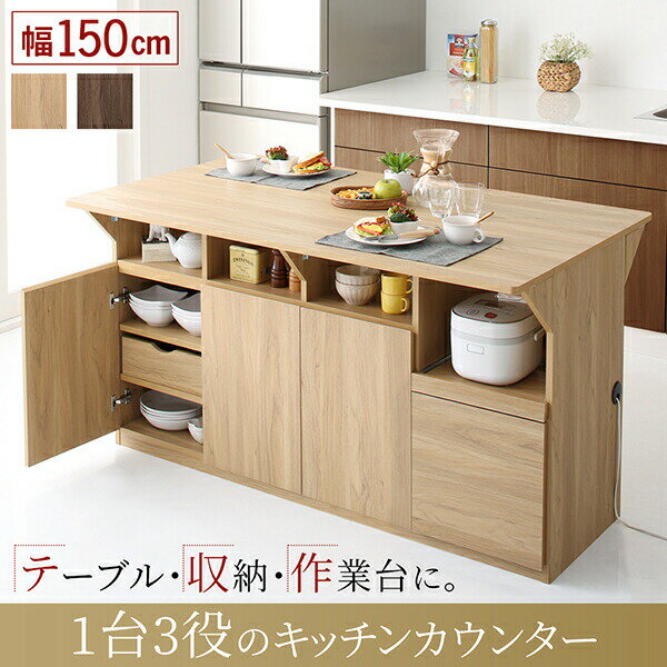 商品詳細サイズ外寸:(約)幅150×奥行85(49.7)×高さ82cm天板:(約)幅150×奥行85(45)cmオープン収納有効内寸(共通):(約)幅34.5×奥行44.3×高さ20.5cm開き戸有効内寸(共通):(約)幅34.5×奥行43.7×高さ50cm/可動棚6枚ボックス有効内寸(共通):(約)幅29.5×奥行39×高さ10.5cm家電収納エリア有効内寸:(約)幅34.5×奥行40×高さ33.5cm深引き出し有効内寸:(約)幅31.5×奥行38.5×高さ32.2cm※( )内の数字はバタフライ天板を閉じた際のサイズです。材質本体:プリント化粧板(グロスマット仕上げ)【耐荷重】天板:(約)60kg天板(折り畳み部分):(約)15kgオープン収納棚:(約)20kg開き戸棚板:(約)20kgカトラリーBOX引き出し:(約)10kg家電収納スライドテーブル:(約)15kg深引き出し:(約)30kg【重量】(約)98.5kgカラーオークナチュラル、ウォルナットブラウン生産国台湾備考※サイズ・重量は概算となります。※スライドレールは、使用後スライドを戻してください。 伸ばした状態で放置すると破損の原因となる可能性がございます。※実際の商品の色に近づけるよう撮影を行っておりますが、 商品の色はご使用のモニターによって実際の明るさや色と多少異なって見える場合がございます。※デザイン・仕様は予告なく変更になる場合がございます。あらかじめご了承下さい。組み立てについて※お客様組み立て品です。2人以上での組立作業をおすすめします。