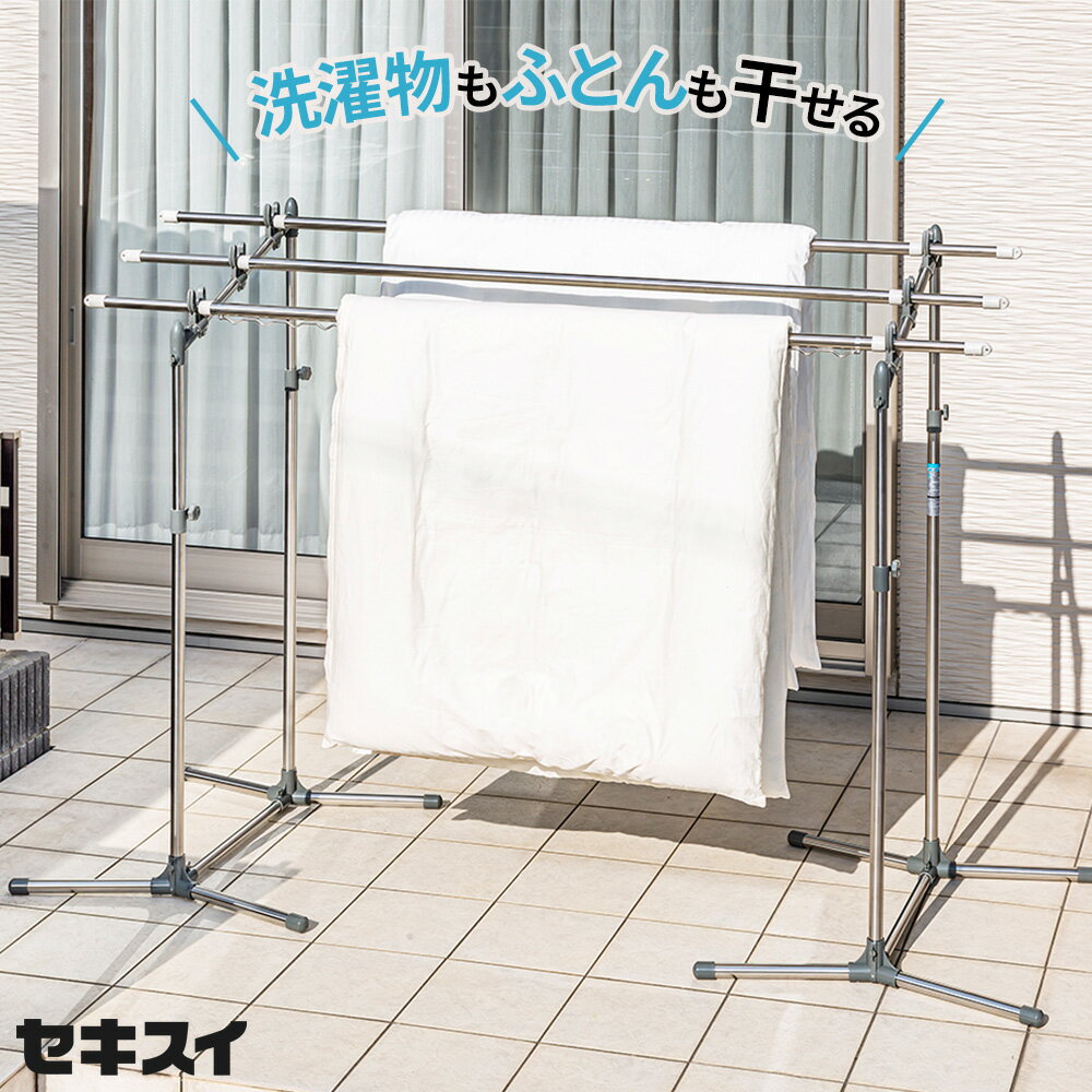 外でたっぷり干せる大容量!耐荷重30kgの大容量!屋外物干しスタンド。たっぷり干せる全体耐荷重はたっぷり30kg。ものほし竿は最大3本掛けられます。※直径3cmまでの物干しざおに対応安定感4本の支柱とH型の脚形状で、重しを使わず高い安定性を実現。乾きやすい工夫段違いに物干竿をかけられるので、日当たり・風通しがよくなり乾きやすい。高さ伸縮ベランダの手すり高さや洗濯物に合わせて、竿受け部の高さを調節可能。用途に合わせて布団を干すときは床に付かないように高くして、洗濯物を干すときは見えないように低くして。用途に合わせてフレキシブルに使えます。シンプルデザインブロー台を使わず足元スッキリ。転倒が気になる方には専用ウエイト(重石)のお取り扱いもございます(別売)。収納ラクラク持ち運びが簡単。雨天時は軒下や室内など風雨のあたらない場所に収納すれば、長くお使いいただけます。竿2本付きセットが選べる物干し台に伸縮物干し竿2本が付いたセットが選べます。ジョイント式短く届いて長く使える、ジョイント式の物干竿。信頼のセキスイ製です。鉄パイプをステンレスで覆った2重構造。ステンレスには、キッチン用品などに使われる18-8ステンレスと同等の耐食性を持つJFE443CTを使用。あわせて買いたい関連キーワード: セキスイ バルコニー テラス ウッドデッキ W支柱型 軽量 簡単移動 安定性 安定感 耐荷重30kg 耐久性 高さ調節 たっぷり たくさん 大容量 干せる おすすめ オススメ 人気 一人暮らし 新生活 単身世帯 ファミリー向け 簡単組み立て 省スペース 狭小 便利 ふとん 掛布団 敷き布団 シーツ リネン類 タオル 洗濯用品 洗濯グッズ ランドリー用品 ランドリーグッズ マンション 団地 約 幅73 奥行79 高さ118 高さ150 センチ cm スッキリ すっきり 4906648102754