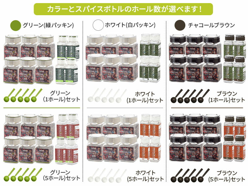 コンロ横収納にピッタリな詰め替えセット。衝撃に強く落としても割れにくい、軽量なプラスチック製の密閉容器。シリコンパッキンで風味を逃がさず湿気を遮ります。使い勝手の良い角型300mサイズと調味料の詰め替えに便利なスパイスボトルのセット。小さじ5本のおまけ付き。セット内容フレッシュロック 角型 300ml×6個 + スパイスボトル 110ml (1ホールまたは5ホール)×4個 + 小さじスプーン5本 プレゼント角型300ml調味料を小分けにして引き出しに収納するのにぴったりの300mlサイズ。和風だし・洋風だし・中華だしなど基本の調味料や薬味・スパイスの保存に。ローリエなどのハーブの収納にもぴったり。スパイスボトル 110ml塩・胡椒などの詰め替えにちょうど良い110mlサイズ。調味料の種類に合わせて、1穴・5穴を選べます。調理中でも片手で簡単に蓋を開けられて便利。小さじスプーン 5cc角型300ml容器の中に収まる専用スプーン。1杯5ccの小さじ1なので、計量スプーンとして使えます。並べて美しく整理収納フレッシュロック角型300mlと高さが揃うからスッキリ収納できます。ご注意食器洗い乾燥機・冷凍室・電子レンジはご使用いただけません。本体の耐熱温度は60度です。熱湯は絶対に入れないで下さい。オーブンおよびグリルでご使用にならないで下さい。火の側や熱い物の側に置かないでください。カラー:グリーン(1ホール)/グリーン(5ホール)/ホワイト(1ホール)/ホワイト(5ホール)/ブラウン(1ホール)/ブラウン(5ホール)1個あたりサイズ(約)角型300ml/幅6.8×奥行7.9×高さ10.4cm スパイスボトル/幅3.8×奥行4.7×高さ10.4cm スプーン/幅3.2×長さ8.75cm すくい部/高さ1.6cm1個あたり容量フレッシュロック角型/300ml スパイスボトル/110ml1個あたり重量(約)角型300ml/80g スパイスボトル/42g材質本体/PET 中フタ/ポリプロピレン 上フタ・内フタ/飽和ポリエステル樹脂 パッキン/シリコーンゴム スプーン/ポリプロピレン耐熱温度本体/60度 中フタ/120度 上フタ・内フタ/100度 パッキン/140度 スプーン/120度耐冷温度本体・中フタ・上フタ・内フタ・パッキン/-20度 スプーン/-20度製造国日本メーカータケヤ化学工業商品バリエーションあわせて買いたい