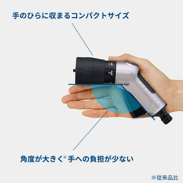 手のひらに収まるコンパクトノズルボディが金属製のコンパクトな散水ノズル。従来のノズルより角度が大きく、上向き散水時などに手の負担が少なくなっています。色々使える4水形キリ・シャワー・ストレート・ジョロの4種類に切り替え可能。使い方らくらくレバーの握り具合で、簡単に通水と止水が切り替えできます。取り付け後も、ノズルの着脱がワンタッチで可能です。適合ホースサイズ内径/7.5〜9mm、外径/13.5mmまでの細ホースに対応しています。サイズ(約)幅11.4×奥行4.3×高さ21.9cm重量(約)346g材質原料樹脂/ABS樹脂、ポリアセタール、ポリプロピレン、塩化ビニル樹脂 金属材料/亜鉛、ステンレス、鋼 ゴム材料/EPDM、NBR最大使用可能水圧0.7MPa適合ホース内径/7.5〜9mm 外径/13.5mmまで品番QG1583製造国ベトナムメーカータカギあわせて買いたい関連キーワード: TAKAGI パーツ オプション 純正 交換用 部品 シャワー ヘッド ホームセンター 散水用品 ホースリール 水撒き 水遣り 水やり 庭 ガーデニング 家庭菜園 洗車 清掃 掃除 植物 水流 パターン 切り替え 通水 止水 ON OFF ストップ 簡単 カチカチ ワンクリック キリ ストレート ジョロ 調整 コンパクト 細いホース用 スリムホース用 小ぶり 握りやすい 小さめ レバー パチッと 接続 ソケット ニップル ノズル単品 4975373040983