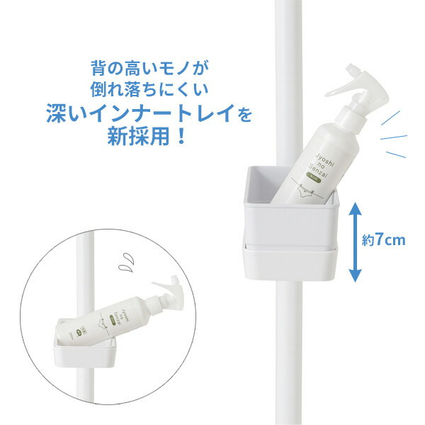 すき間や部屋の隅が収納スペースに!【TSR-S W】使っていなかった空間が収納スペースに早変わりする、 突っ張り式の小物置きラック。洗面台の上やカウンターの上からつっぱれる、ショートタイプの「TSR-S W」です。2種類の高さのインナートレイ用途によって使い分けられる、深さの違う2種類のインナートレイを採用。付属のトレイ5つのうち2つが、背の高いものが倒れ落ちにくい、深型タイプになりました。トレイを外して使い勝手広がるインナートレイは取り外しが可能。これにより、タオルを掛けたり、長いものを立て掛け収納したりすることもできます。丸洗い出来て衛生的インナートレイを外して丸洗いできるのでお手入れ簡単。衛生面が気になる洗面用具やキッチン周りの収納として嬉しい機能です。洗面所やキッチンの収納に設置幅約9cmのスリムサイズなので、洗面台上の壁際や、キッチンカウンターの上などにおススメです。玄関やリビングにも玄関やリビングに設置し、インテリア小物やカギの置き場にも◎。 全体耐荷重約8kg強力な突っ張り機能で、約8kgまでの荷重に対応します。※ トレー1つあたり、2kgです。取り付け簡単つっぱり式で簡単取付け。位置決めの際に便利な仮止め機構付きです。取付け可能な場所設置面と天井の間が120〜200cmの場所ご注意カーペットなど、敷物の上に設置しないでください。 バネで圧着取付するため、設置面は梁や横桟などしっかりした場所をお選びください。サイズ(約)幅9〜53×高さ120〜200cmトレイ取付高さ(約)15〜95cm材質パイプ/樹脂コーティングスチール 部品/ABS樹脂、PP樹脂 圧着部/EVA樹脂 バネ・ネジ類/スチール(メッキ)耐荷重(約)全体/8kgまで(トレイ1個あたり約2kg)品番TSR-SW製造国中国メーカー積水樹脂商事商品バリエーションあわせて買いたい関連キーワード: 洗面台 隙間 棚 DIY ドライヤー 小物 歯ブラシ 化粧品 整髪料 ミラー 鏡台 脱衣所 スプレー 洗剤 リビング 下駄箱 靴箱 ガレージ 車庫 インテリア デッドスペース 活用 ポール スタンド トレイ トレー トイレ 置き場 物干し タオル掛け 小物掛け ショート 押し入れ クローゼット 天井 支える 支柱 便利 簡単 手軽 一人暮らし 新生活 アパート マンション 傷つけない 跡が付かない 跡を付けない おすすめ 人気 グッズ 4570030471232