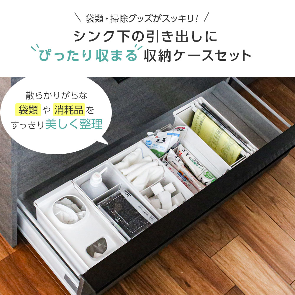 キッチンの引出しがすっきり整う!トトノシリーズゴミ袋やレジ袋、キッチンまわりの掃除用品をすっきり収納できるケース。キッチンのシンク下、最下部の引き出しに収まるサイズを組み合わせた当店オリジナルセットです。お掃除に使えるメラミンスポンジのおまけ付き。(商品イメージに使用しているビニール袋・ふきん等は付属しません。)選べる3タイプ収納する引き出しの高さや幅に合わせて3種類のセットをご用意しました。【ベーシック 6点セット】セット内容/調味料収納ボックス×2・レジ袋収納ボックス×1・ゴミ袋ストッカー×1・ポリ袋収納ケース×2ゴミ袋・レジ袋・フリーザーバッグ・お掃除グッズなど様々なものがまるっと収納できる基本のセット。引き出し(内寸)の高さ20cm・幅62cmが必要です。【ワイド 5点セット】セット内容/調味料収納ボックス×3・レジ袋収納ボックス×1・ゴミ袋ストッカー×1幅広タイプの引き出しに!ゴミ袋・レジ袋・こまごました消耗品をたくさん収納できるセット。引き出し(内寸)の高さ20cm・幅70cmが必要です。【フラット 5点セット】セット内容/調味料収納ボックス×2・レジ袋収納ボックス×1・ポリ袋収納ケース×2浅型タイプの引き出しに!レジ袋・ポリ袋・フリーザーバッグなどを高さ15cmのスペースで収納できるセット。引き出し(内寸)の高さ15cm・幅48cmが必要です。※LIXIL製キッチンの最下段など浅い引き出しに対応しています。自由になんでも収納!調味料収納ボックス付属の仕切り2枚を使って、掃除用品やふきん・スプレー・ゴム手袋・排水溝ネットなど様々な消耗品を収納できます。約6.5・5.5cm間隔で仕切り位置を調節できます。ポイポイ入れるだけ!レジ袋収納ボックスレジ袋をストックしてサッと取り出せるケース。「IN」の挿入口からポイ。取り出しは「OUT」の取り出し穴から。掛けるだけ!ゴミ袋ストッカーゴミ袋をバーに引っ掛けて収納、サッと取り出せるストッカー。バーは3本付属しています。取り出しやすい!ポリ袋収納ケースポリ袋・ジッパー付き保存袋・水切りネットなどを立て置きしてコンパクトに収納。支え板に袋を掛けてセットするから取り出しやすい!ジョイント可能ケースやボックスにはジョイント部品が各1個付属。同じ高さのケースと連結できるので、ケースの位置ズレを防ぐことができます。すぐに使える!メラミンスポンジのおまけ付き調味料収納ボックスに入れて、すぐに使えるメラミンスポンジのおまけ付き。あわせて買いたい関連キーワード: 収納 キッチン システムキッチン 深引き出し ストッカー 調味料 ポリ袋 ビニール袋 レジ袋 まとめて収納 調理器具 整理整頓 日用品 保存 保管 ケース ボックス BOX キッチン収納 連結 ジョイント部品付き トトノ TOTONO 水洗い 簡単手入れ プラスチック製 取り出しやすい モジュール収納 すっきり スッキリ 片付く おすすめ オススメ 便利 使いやすい キッチン用品 キッチングッズ 台所用品 台所グッズ コンパクト 省スペース 立てて収納 耐震 防災 地震対策 防災対策 耐震グッズ 防災用品 4945680100229 4945680100243 4945680100083 4945680100274 4986614226851スタッフの「まめばなし」ケコミを有効活用!「トトノ シンク下収納セット」は、キッチンの1番下の引き出しにぴったりのセットなのですが、この引き出し部分の名前…知りませんでした。「ケコミ」というそうです。この部分、従来はデッドスペースとされていましたが、最近では収納スペースとして活用される傾向があるとのこと。ご自宅のキッチンももしかしたら引き出しになっているかもしれません!ぜひ1度ご確認ください。商品の撮影は、モデルハウスをお借りしておこなっているのですが、この「ケコミ」部分の高さはメーカーによって異なります。TOCLASの引き出しには、ゴミ袋ストッカー(高さ20cm)が入るのに、LIXILの引き出しには入らないという事件もありました(涙)LIXILの「ケコミ」に対応したセット(フラットタイプ)もご用意していますので、ご注文の前に必ず引き出しの内寸高さを測ってみてくださいね! スタッフK陸上部の娘2人のため毎日送迎ばかりの母。映えるおうちに憧れるものの多忙な現実とのギャップが悩み。