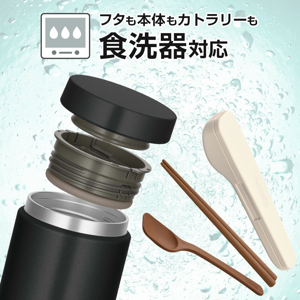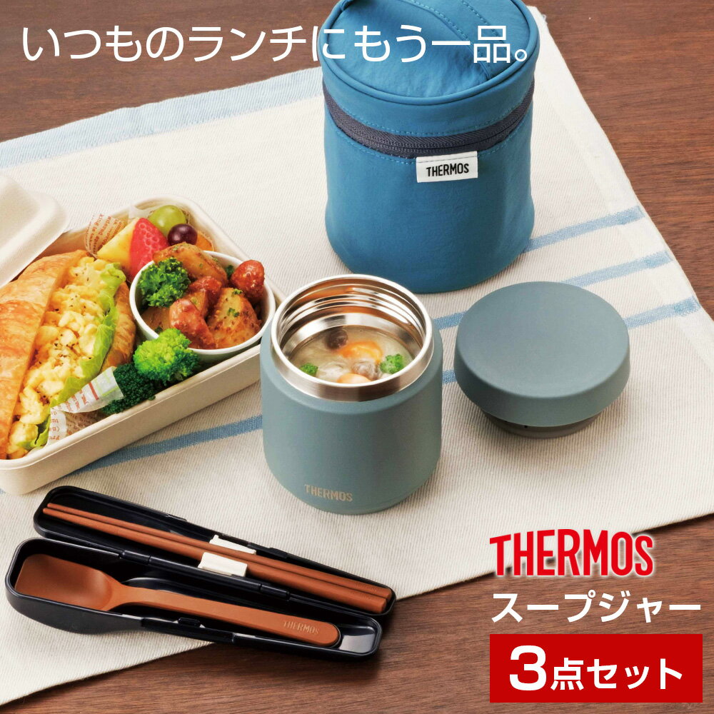 いつものランチにもう一品!本体もフタも丸ごと食洗器OK!洗いやすさにこだわったサーモスのスープジャー。【スープジャー】【専用ポーチ】【スプーン・ハシセット】のお得な3点セット。持ち運びに便利なコンパクトサイズの0.3L。食洗器での洗いやすさを追求!ハシ・スプーンもスープジャーも、全パーツ食洗器対応!スープジャーの蓋はパーツが分かれており隅々まで洗いやすい。内フタには水抜き穴付き。フタの内側の凹凸を減らして洗浄後の水滴が残りにくい清潔仕様に。中がアツアツでもラクラクオープンフタを回すだけで中の圧力を逃がす、サーモス独自のクリックオープン構造採用。熱々を入れてもラクラク開けられます。保温力ならやっぱりサーモスステンレス魔法びんと同じ高い保温・保冷力。寒い季節でも暑い季節でも、おいしい温度をキープ!熱々のお味噌汁・スープ・シチュー・カレーから、冷えたフルーツ・デザートまで。ランチの幅が広がります。ポーチに入れるとスープがもっとあったかアイソテック2断熱構造に複数の断熱材を組み合わせた厚手のフタで、スープジャーの保温力・保冷力がよりアップ。汚れたら洗濯機で丸洗い可能。お手入れラクラク。カトラリーポケット付きカトラリーが収納できる背面ポケット付き。「スプーン・ハシセット」が収納できます。ご注意スープジャーは電子レンジではお使いいただけません。スープジャーを煮沸しないで下さい。熱い飲食物は十分に加熱(沸騰)し、すぐに本体に入れフタを閉めて下さい。生ものなど腐敗しやすいものやドライアイス・炭酸飲料は入れないで下さい。熱い(冷たい)飲食物を入れた際、本体外側が熱く(冷たく)なる場合は保温(保冷)不良です。腐敗の原因になりますので、ご使用を中止して下さい。保温保冷効果を高めるために真空二重構造の内部に入れている金属箔がこすれて音がすることがありますが、異常ではありません。選べるカラー:スープジャー/ブラック、アイボリー、グレーグリーン ポーチ/ブラック、ブルー、サンドベージュ スプーン・ハシ/ピュアホワイト、ブラウン、ディープレッド、ネイビー