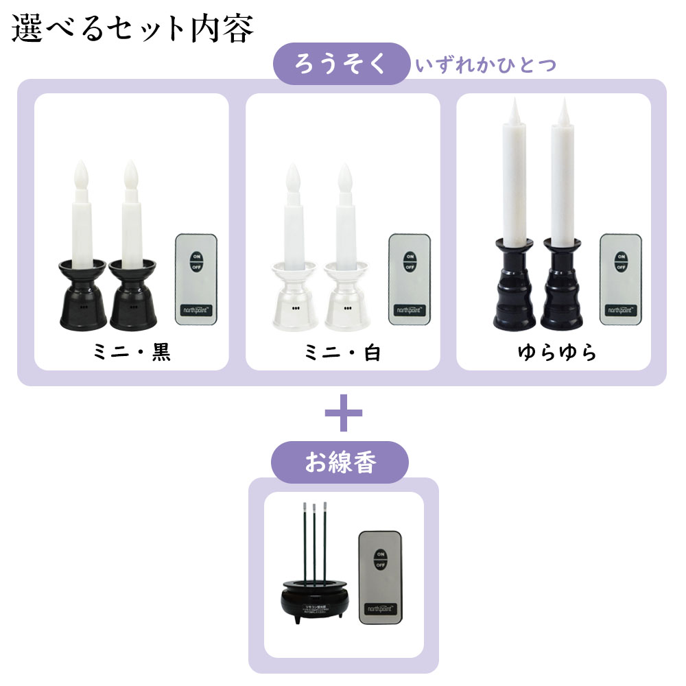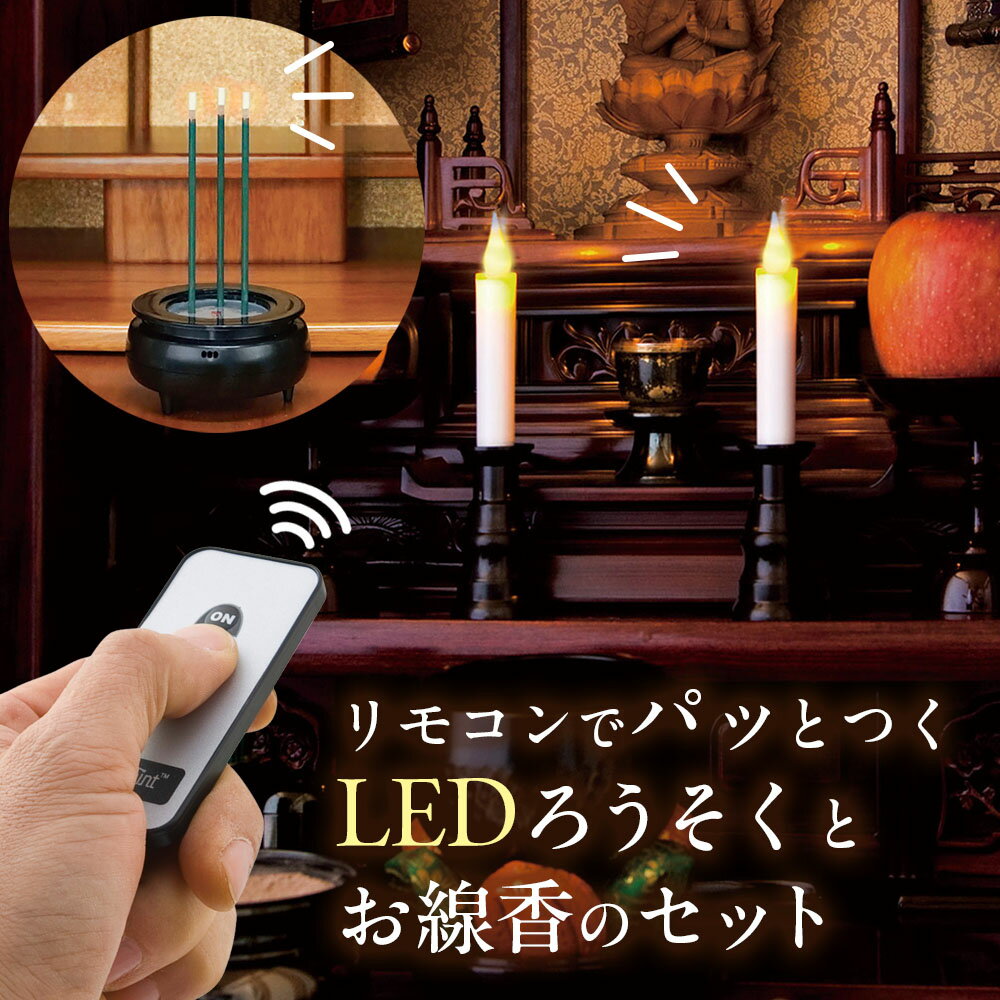 LED ろうそく リモコン式安心LEDローソク+線香セット 黒/白 FIN-1024/FIN-806 | 電池式 リモコン 火を使わない 電気 ロウソク 仏具 仏壇 電気ろうそく リモコン付き 自動消灯