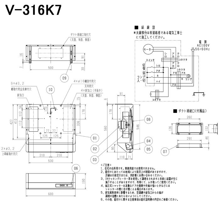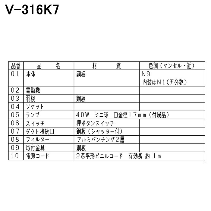 ※お客様のご都合による商品の返品・交換・キャンセルは受け付けておりません。 商品仕様をご確認の上、お間違いの無いようお願い致します。 ※品番通りのお手配になりますのでご注文前に必ず商品の仕様・サイズ・品番・色等を確認の上ご注文お願いします。 当店のお買い物ガイドも併せてご確認ください。 ◆メーカー:三菱電機 MITSUBISHI ◆品名:レンジフードファン 浅形 標準タイプ ◆品番:V-316K7 (V316K7) ◆幅(mm):600 ◆奥行(mm):580 ◆高さ(mm):190 ◆ファン:ターボファン ◆吸込部はつ油塗装 ◆クロスキャッチフィルター(2層) ◆風逆流防止シャッター付 ◆抗菌仕様(スイッチ操作部) ◆2芯平形ビニルコード付(有効長約1m) ◆排気5方向(後・上左・上右・左部・右部)・・・ノックアウト式(後・上右・左部・右部) ◆照明ランプ(口金径17mm40Wミニ球)付 ◆付属品:壁取付用金具 ◆付属品:木ネジ ◆沖縄県は配送不可となります。ご了承下さい。