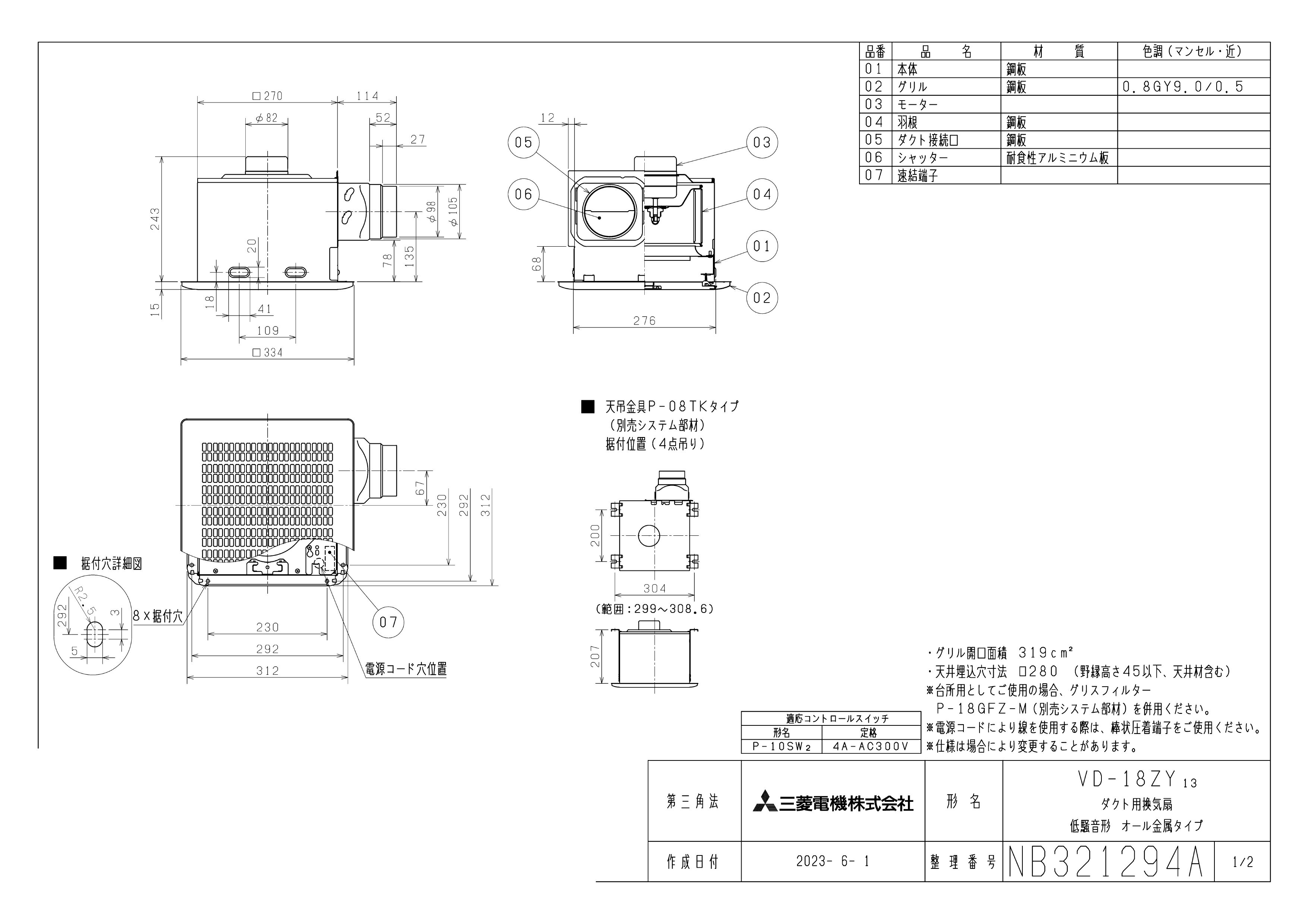 ※お客様のご都合による商品の返品・交換・キャンセルは受け付けておりません。 商品仕様をご確認の上、お間違いの無いようお願い致します。 ※品番通りのお手配になりますのでご注文前に必ず商品の仕様・サイズ・品番・色等を確認の上ご注文お願いします。 当店のお買い物ガイドも併せてご確認ください。 ◆メーカー:三菱電機 MITSUBISHI ◆品名:ダクト用換気扇 天井埋込形 台所用 低騒音形 ◆品番:VD-18ZY13 (VD18ZY13) ◆ボディ:金属 ◆ファン:金属(シロッコファン) ◆グリル:金属 ◆接続パイプ:100φ(mm) ◆埋込寸法:280mm角 ◆質量:5kg ◆沖縄県は配送不可となります。ご了承下さい。