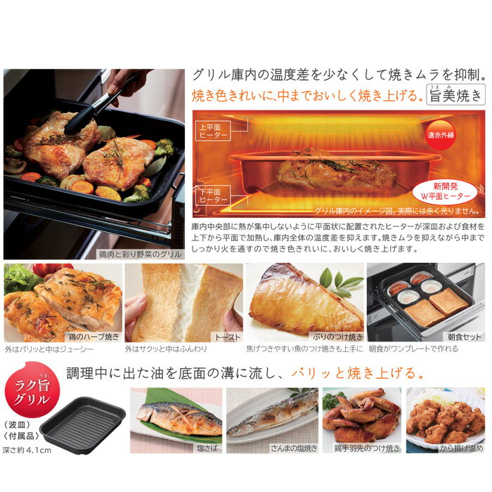 ※お客様のご都合による商品の返品・交換・キャンセルは受け付けておりません。 商品仕様をご確認の上、お間違いの無いようお願い致します。 ※型番通りのお手配になりますのでご注文前に必ず商品の仕様・サイズ・型番・色等を確認の上ご注文お願いします。 当店のお買い物ガイドも併せてご確認ください。 ◆メーカー:日立 HITACHI ◆品名:IHクッキングヒーター 火加減マイスター N8Tシリーズ 幅60cm 3口IH 鉄・ステンレス対応 シルバー IH調理器 ◆品番:HT-N8STF-S (HTN8STFS) ◆設置タイプ:ビルトイン ◆ヒーター:3口 ◆トッププレート幅:60cm ◆寸法:幅600×高さ232(組込み高さ220)×奥行546mm ◆カラー:シルバー ◆重量:20kg ◆ロースター:両面 ◆火力 ・左:3.2kW ・右:3.2kW ・中央:1.6kW ◆グリル火力 ・上:1.4kW ・下:1.2kW ◆火力調整 ・左右IH:9段階 ・中央IH:7段階 ◆電源:200V ◆電気容量:30A ◆消費電力:5.8kW ◆トッププレート色:シルバー系 ◆左右フリー :○ ◆チャイルドロック :○ ◆揚げ物温度調整:○ ◆タイマー:○ ◆水無ロースター:○ ◆自動湯沸し :○ ◆天面操作:ガラスタッチ式 ◆焼き色きれい、中までおいしく焼き上げる「旨美焼き」 ◆グリル庫内をまるごと拭ける「フラット庫内」 ◆文字が大きく見やすい「フルドット液晶」 ●グリル庫内の温度差を少なくして焼きムラを抑制。焼き色きれいに、中までおいしく焼き上げる「旨美焼き」。 庫内中央部に熱が集中しないように平面上に配置されたヒーターが深皿および食材を上下から平面で加熱し、庫内全体の温度差を抑えます。焼きムラを抑えながら中までじっくり火を通すので焼き色きれい、おいしく焼き上げます。 鶏のハーブ焼きなどの肉料理やさんまなどの魚はもちろん、トーストやクッキーなどもおいしくきれいに仕上げます。さらにパンや卵、ウインナーなどを同時に調理できる「朝食セット」を新たに搭載しました。 ●グリル庫内をまるごと拭ける「フラット庫内」で、ラクラクお手入れで、すっきりきれい。 グリル庫内はまるごと拭けるフラット庫内を採用。左右側面・奥面はフッ素コートなので、油汚れが落ちやすく、お手入れラクラクです。 さらに深皿(ラク旨グリル)で調理するから庫内への油跳ねをガードし庫内が汚れにくいので、おそうじの手間を減らせます。「ラク旨グリル」は表面がフッ素コートで汚れが落としやすい。グリルドアの汚れが気になったときは簡単に外せて丸洗いできます。 ●調理状況が一目でわかる、文字が大きく見やすい「フルドット液晶」を採用。 トッププレート中央に4.3インチのフルドット液晶を配置。すべて(左右中央IH、グリル)の設定と運転状態が大きな文字とイメージしやすいイラストで表示されるのでわかりやすい。さらに火力の強さを「とろ火」はグリーン、「弱火」はイエロー、「中火」はオレンジ、「強火」はレッドの4色でわかりやすく表示する「4色カラーLED」も搭載。 よく使う弱火・中火・強火をワンタッチで切り替えできる「ワンタッチ火力ボタン(左右IH)」も継続して採用。 ◆沖縄県は配送不可となります。ご了承下さい。 ※発送先が北海道・沖縄・離島地域に該当するお客様はご注文時の入力フォームまたは備考欄等に「送料○○円了承済」と記載ください。※○○部分に該当の金額を入れてください。記載がない場合は送料了承の確認が取れてからの発送となりますので、発送が遅くなる場合がございます。入力フォームには上記の内容以外の記載はされませんようにお願い致します。また、該当地域以外のお客様は無記入でお願い致します。追加送料金額(商品1点につき):北海道→5,500円(税込)、沖縄県・離島地域→19,800円(税込)