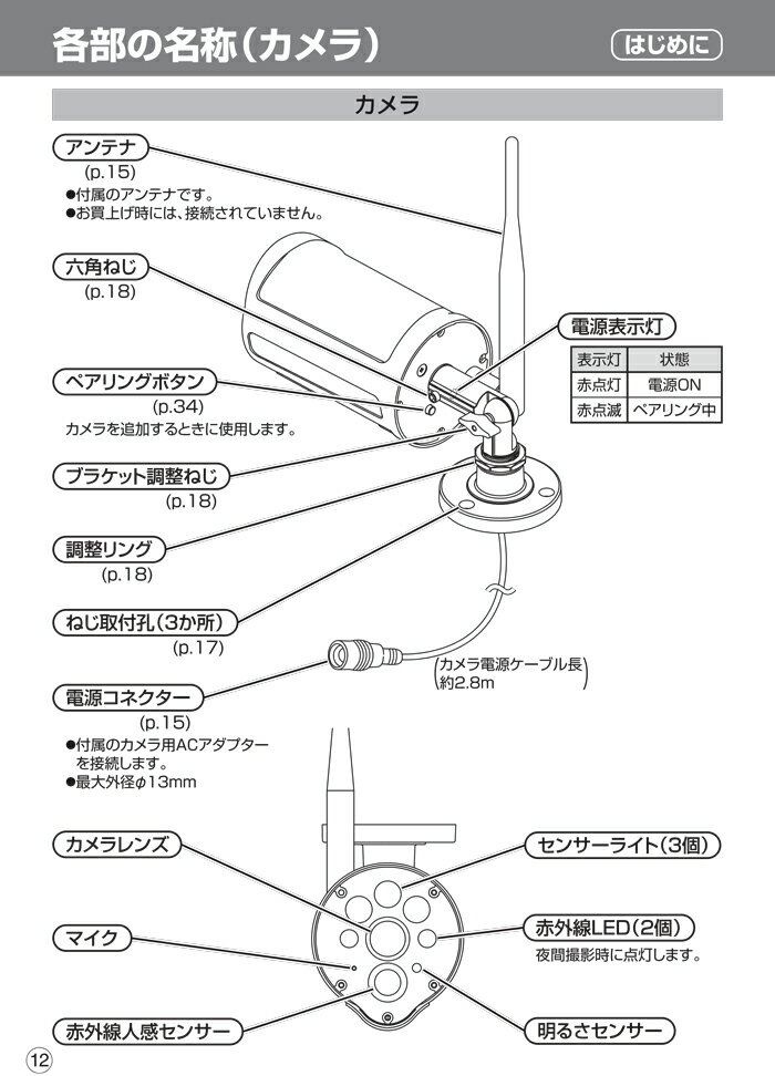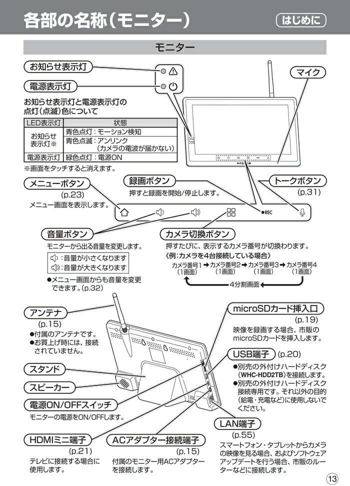 ※お客様のご都合による商品の返品・交換・キャンセルは受け付けておりません。 商品仕様をご確認の上、お間違いの無いようお願い致します。 ※型番通りのお手配になりますのでご注文前に必ず商品の仕様・サイズ・型番・色等を確認の上ご注文お願いします。 当店のお買い物ガイドも併せてご確認ください。 ◆メーカー:マスプロ ◆品名:ワイヤレスカメラセット モニター&カメラセット(3MP) 10インチモニター 警告・通話機能対応 バレットタイプカメラ センサーライト付 防犯MASPRO ◆品番:WC3A10ML 【カメラ部】 ◆イメージセンサー:1/2.8インチCMOSセンサー(約300万画素) ◆有効画素数 H×V:2304×1296 ◆映像圧縮方式:H.264、H.265 ◆撮影距離:約1.5m〜 ◆撮影画角:水平:約83°、垂直:約45° ◆センサーライト:白色LED、最大1000lm、光量調整:4段階 ◆撮影照度:0lx以上(赤外線白黒撮影) ◆赤外線照射距離:最大15m ◆赤外線人感センサー:検知距離:約7m(周辺温度20℃のとき)(検知角 約80°) ◆内蔵スピーカー:あり ◆内蔵マイク:あり ◆無線通信 ・使用周波数帯域:2.4GHz(2412〜2484MHz) ・変調方式:DSSS、OFDM、DBPSK、DQPSK、CCK、16-QAM、64-QAM ・データレート:最大18Mbps ・通信距離:最大300m(見通しがよく、電波の妨害のない環境において ◆カメラ電源ケーブル長:約2.8m(電源) ◆使用温度範囲:−10〜+50℃(ACアダプターは0〜+40℃) ◆防じん防水性能:IP66(軒下など直接雨がかからない場所をおすすめします) ◆電源DC9V(ACアダプター):AC100V ◆消費電力:12W(22.8VA)(赤外線点灯時) ◆外観寸法 H×W×D:82×75×119mm(カメラ本体) ◆質量(重量):約650g 【モニター部】 ◆モニター H×V:10.1インチフルカラーモニター(1024×600) ◆タッチパネル:静電式 ◆カメラ接続台数:最大4台(4台同時録画可能) ◆録画保存:microSDHC/microSDXCメモリーカード(最大256GB)(クラス10以上)、外付けハードディスクWHC-HDD2TB(別売品)(最大2TB) ◆録画解像度 H×V:2304×1296(3MP)/1920×1080(Full HD)/1280×720(HD) ◆録画モード:モーション検知、スケジュール、マニュアル ◆上書録画:可能(ON/OFF):4台同時録画可能 ◆再生方式:本体モニター再生、スマートフォン、タブレット(録画ファイル形式:ASF、WMV) ◆USB端子:外付けハードディスクWHC-HDD2TB専用 ◆HDMIミニ端子:タイプC、Ver1.4対応(1080i/720p入力対応のハイビジョンテレビモニターが必要) ◆防じん防水性能:屋内用(非防水) ◆使用温度範囲:0〜+40℃ ◆電源DC5V(ACアダプター):AC100V ◆消費電力:4.6W(10.4VA) ◆外観寸法 H×W×D:137×202×59mm ◆質量(重量):約390g 【付属品】 ◆カメラ用AC アダプター(コード約1.7m)×1個 ◆モニター用AC アダプター(コード約1.4m)×1個 ◆カメラ用アンテナ×1本 ◆モニター用アンテナ×1本 ◆アンカー、ねじ(カメラ設置用)×各3本 ◆位置決めガイド×1部 ◆六角レンチ(カメラ角度調整用)×1個 ◆LAN ケーブル(約1.5m)×1本 ◆沖縄県は配送不可となります。ご了承下さい。