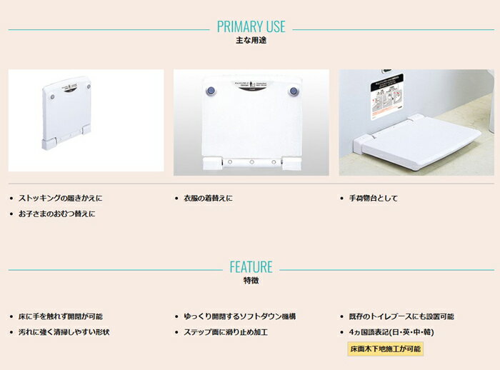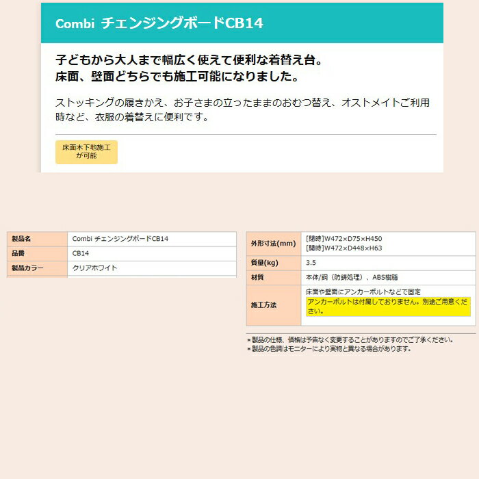 ※お客様のご都合による商品の返品・交換・キャンセルは受け付けておりません。 商品仕様をご確認の上、お間違いの無いようお願い致します。 ※型番通りのお手配になりますのでご注文前に必ず商品の仕様・サイズ・型番・色等を確認の上ご注文お願いします。 当店のお買い物ガイドも併せてご確認ください。 ◆メーカー:コンビウィズ ◆品名:チェンジングボード クリアホワイト | トイレアクセサリー ◆品番:CB-14 (CB14) ◆外形寸法(mm) ・閉時:W472×D75×H450 ・開時:W472×D448×H63 ◆質量(kg):3.5 ◆材質本体/鋼(防錆処理)、ABS樹脂 ◆子どもから大人まで幅広く使えて便利な着替え台。 床面、壁面どちらでも施工可能になりました。 ストッキングの履きかえ、お子さまの立ったままのおむつ替え、 オストメイトご利用時など、衣服の着替えに便利です。 ◆商品スペックにつきましてはメーカー公式サイトをご確認ください。 ※沖縄県は配送不可となります。ご了承下さい。 ※発送先が北海道・沖縄・離島地域に該当するお客様はご注文時の入力フォームまたは備考欄等に「送料○○円了承済」と記載ください。 ※○○部分に該当の金額を入れてください。 記載がない場合は送料了承の確認が取れてからの発送となりますので、発送が遅くなる場合がございます。 入力フォームには上記の内容以外の記載はされませんようにお願い致します。 また、該当地域以外のお客様は無記入でお願い致します。 追加送料金額(商品1点につき):北海道→5,500円(税込)、沖縄県・離島地域→19,800円(税込) ※お届け先に法人・個人事業者名を記載下さい。 ※こちらの商品はお届け先名に法人名もしくは屋号が必要となっておりますが、 個人名でご注文をご希望の場合、追加送料をいただければお受けすることができますので、 ご注文前にお問い合わせくださいますようお願い申し上げます。 お問い合わせの際はご希望の商品の型番と数量、お届け先の郵便番号をお知らせください。 ※こちらの商品は代引き決済はご利用頂けません。 ※代引でご注文を頂きましたらキャンセル処理をさせて頂きますのでご了承ください。 ※メーカー保証を受けるために設置場所の店舗名が必要になりますので、 オプション入力欄もしくは備考欄にご記入ください。 ※発送予定日はメーカー在庫がある場合の納期となっております。