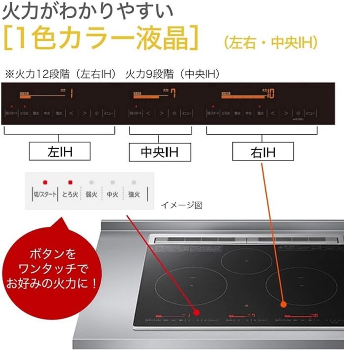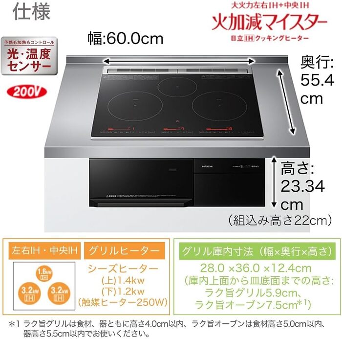 ※お客様のご都合による商品の返品・交換・キャンセルは受け付けておりません。 商品仕様をご確認の上、お間違いの無いようお願い致します。 ※型番通りのお手配になりますのでご注文前に必ず商品の仕様・サイズ・型番・色等を確認の上ご注文お願いします。 当店のお買い物ガイドも併せてご確認ください。 ◆メーカー:日立 ◆品名:ビルトインIHクッキングヒーター 60cm幅 3口IH 単相200V ディープブラック 鉄・ステンレス対応 | 火加減マイスター グリル 料理 調理 ◆品番:HT-M8AKTF(K) (HTM8AKTF(K)) ◆カラー:ディープブラック ◆タイプ:3口IH 鉄・ステンレス対応 ◆トッププレート幅:60cm ◆付属品:ラク旨グリル/ラク旨オーブン(料理集は取扱説明書に掲載) ◆調理機能 【IH】適温調理、麺ゆで、煮込み、保温、湯沸かし、炊飯 【グリル機能】魚焼き、焼き物、過熱水蒸気、ノンフライ 【オーブン機能】魚煮つけ(切身) ◆操作部 【IH】1色カラー液晶、ワンタッチ火力ボタン、ガラスタッチ式 【グリル】LED ◆電圧、総消費電力:単相200V-5.8kW ◆節電モード:総消費電力を4.8kW、4.0kWに切替可 ◆プラグ容量:単相200V用 ◆コード:250V-30A(接地極付き)3芯キャブタイヤケーブル 長さ0.7m ◆外形寸法(幅×奥行×高さ):600×554×233.4mm(組込み高さ220mm) グリル庫内寸法(幅×奥行×高さ):ビッグ庫内280×360×124mm (庫内上面から皿底面までの高さ:ラク旨グリル59mm、ラク旨オーブン75mm) ◆質量:約21.0kg ◆その他特長 ・フラットトッププレート/薄形フレーム ・温度低減ドア<キッズデザイン賞> ・脱煙機能(グリル) ・光・温度センサー(左右IH) ・レンジフードファン連動 ◆左右IH:100W相当〜3.2kW 12段階 ◆中央IH:100W相当〜1.6kW 9段階 ◆グリルヒーター ・シーズヒーター 【上】1.4kW 【下】1.2kW( 触媒ヒーター250W) ◆グリル 【上下】1.21kW相当・1.01kW相当・710W相当 【上】900W相当・600W相当・300W相当 【下】900W相当・600W相当・300W相当 【IH機能】 ◆IH便利メニュー ■煮込み 左・右 IH ■麺ゆで 左・右 IH ■炊飯 中央 IH ■保温 中央 IH ■湯沸かし 中央 IH ◆適温調理:2メニュー(焼き物、揚げ物:油量200〜800g)80種類 【グリル機能】 ◆ラク旨グリル(オート調理) ■魚焼き 3メニュー(丸焼き、切身・干物、つけ焼き)22種類 ■焼き物 2メニュー(鶏のグリル、ハンバーグ)9種類 ■過熱水蒸気 3メニュー(鶏のグリル、切身・干物、揚げ物温め)14種類 ■ノンフライ 1メニュー(ノンフライ)29種類 ■蒸し物<専用フタ> ー ■冷凍食品 ー ◆ラク旨グリル(手動調理):3メニュー(グリル上下、グリル上、グリル下)10種類 ◆ラク旨オーブン(オート調理) ■オーブン ー ■魚煮つけ(切身)<姿煮:専用フタ> 1メニュー(魚煮つけ(切身))4種類 ■水なし調理<専用フタ> ー ■冷凍食品 ー ■パン<専用フタ> ー ◆ラク旨オーブン(手動調理):5メニュー(トースト、オーブン:13段階温度設定80〜280℃、グリル上下、グリル上、グリル下)63種類 ◆脱煙機能・水なし ◆温度低減ドア 【便利機能】 タイマー ■独立4か所 残り時間 【IH】9時間55分 【グリル】30分 【オーブン】90分 経過時間 【IH】60分 便利機能 タイマー ■独立4か所 残り時間*5 【IH】9時間55分 【グリル】30分 【オーブン】90分 経過時間 【IH】60分 ◆レンジフードファン連動(IHやグリルの運転・停止に連動) ◆音声ガイド:切・3段階音量調節 ◆運転音 アルミ・銅鍋:ー 鉄・ステンレス鍋:約39/35/30dB(火力により3段階に変わります。) 1.ラク旨グリル&オーブン 多彩な料理を手軽においしく。「ラク旨グリル&オーブン」 シーズヒーターの直火とプレート加熱で食材をすばやく焼き上げます。 深めの平皿で、火加減がむずかしかった魚の煮つけもオートで調理。 2.お手入れしやすい 深めの皿で油跳ねをガード 庫内がきれい 深めの皿で魚・肉の油跳ねをガードするから、グリル庫内のおそうじの手間が低減 庫内のおそうじの手間を減らせる 深皿の「ラク旨グリル」「 ラク旨オーブン」 グリル調理後も、オーブン調理後も、庫内はきれいなままで、面倒なおそうじの手間を減らせます。 ※ニオイが気になったときは、クリーニングで庫内を高温にして乾燥させれば、ニオイを軽減できます。 排気がきれい グリル調理中の煙やニオイも抑える「脱煙機能」 煙を水蒸気と二酸化炭素に分解してから排出するのでキッチン内も快適。 触媒用ヒーターが油煙を焼き切るから、面倒なお手入れや交換は不要です。 お手入れラクラク 焼き網がないので、調理後のお手入れがラクラク ・焼き網だと洗うのが大変 ・「ラク旨グリル」は表面がフッ素コートで汚れが落としやすい ・「ラク旨オーブン」は表面が平らなので洗いやすい ・グリルドアの汚れが気になったときは簡単に外せて丸洗いできる 使わないときは、重ねてコンパクトに収納できます 「ラク旨グリル」と「ラク旨オーブン」は、重ねて庫内に収納できます。 グリルやオーブンを使わないときも置き場所に困ることはありません。 段差が少ない「薄形フレーム」 トッププレートの外周を囲むフレームを薄形にして段差を少なくしました。