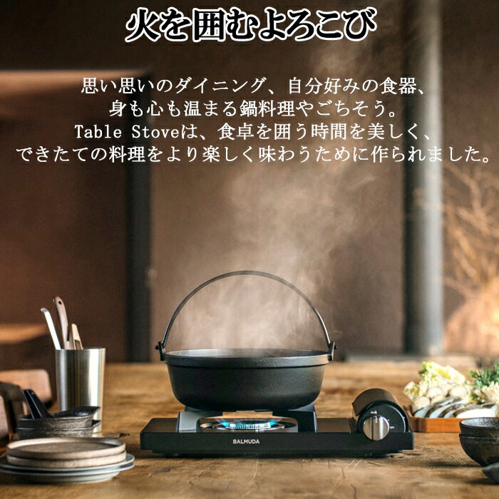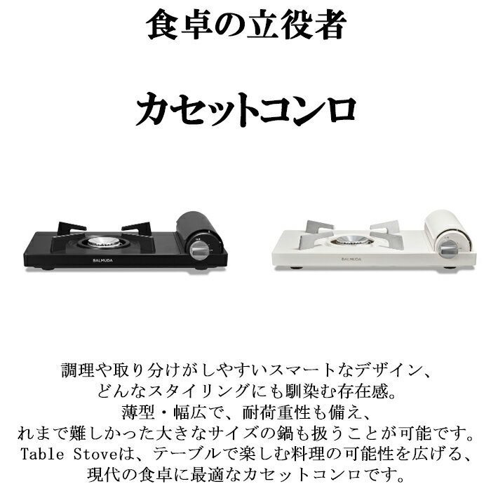 ※お客様のご都合による商品の返品・交換・キャンセルは受け付けておりません。 商品仕様をご確認の上、お間違いの無いようお願い致します。 ※型番通りのお手配になりますのでご注文前に必ず商品の仕様・サイズ・型番・色等を確認の上ご注文お願いします。 当店のお買い物ガイドも併せてご確認ください。 ◆メーカー:バルミューダ ◆品名:カセットコンロ ホワイト 家庭用 Table Stove テーブルストーブ 調理 料理 お洒落 | 卓上 ヒートパネル方式 ◆品番:KGS01JP-WH (KGS01JPWH) ◆カラー:ホワイト ◆本体寸法:幅 425mm × 奥行 274mm × 高さ 92mm ◆本体重量:約2.5kg ◆使用可能鍋サイズ:外径30cm以下(土鍋10号相当) ◆最大発熱量:3.1kW(2,700kcal/h) ◆安全機能:ヒートパネル方式、圧力感知安全装置、容器装着安全機構 ◆パッケージ内容:本体、取扱説明書(保証書付) ◆火力:3.1kW(2700kcal/h)※ 1 ◆ガス消費量約228g/h※1 ◆使用ガス:ブタンガス ◆使用容器(ボンベ)<容量>:マイ・ボンベL、マイ・ボンベα < 250g>※ 2 ※1 周囲温度20〜25℃ ガス消費量・使用時間は、表示火力にもとづく理論値です。実際とは異なる場合があります。 ※2 本製品には容器(ボンベ)は含まれておりません。 食卓の立役者 カセットコンロ 調理や取り分けがしやすいスマートなデザイン、 どんなスタイリングにも馴染む存在感。 薄型・幅広で、耐荷重性も備え、これまで難しかった大きなサイズの鍋も扱うことが可能です。 Table Stoveは、テーブルで楽しむ料理の可能性を広げる、 現代の食卓に最適なカセットコンロです。 火を囲むよろこび 思い思いのダイニング、自分好みの食器、 身も心も温まる鍋料理やごちそう。 Table Stoveは、食卓を囲う時間を美しく、 できたての料理をより楽しく味わうために作られました。 【Table Stoveの特徴】 大きな鍋もOK。 料理の幅がぐっと広がる ゆとりのある幅広設計で、直径30cmまでの鍋やフライパンなどが使用可能。 4人前のパエリア、6人前の鍋料理など、毎日の食事からおもてなしまで、さまざま活躍します。 見やすく、取りやすく、美しく わずか73mmの超薄型。座ったままでも料理が見やすく、取り分けが容易です。 さらに、シンプルでフラットな作りが、お気に入りの鍋や料理を美しく引き立てます。 いつでもアツアツ。 強火も弱火も思いのまま 弱火の火力調整がスムーズにできる「弱火ノッチ機構」搭載。 とろ火による調理や、できあがった料理の保温に便利です。 いつでもアツアツのおいしさをお楽しみください。 【高い堅牢性と安全性】 アルミダイキャスト製 アルミ合金に高い圧力をかけて成形する鋳造技術により、優れた強度に加え、高い耐久性と耐食性を実現。 さらに上質な質感に仕上げました。 安心・安全のための機能 内部の熱を効率的に放出する独自の放熱機構。 ボンベの過熱時に自動でガス供給を停止する安全装置など、高い安全性能も備えています。 料理もテーブルも引き立てるデザイン 充実の性能 ガスを無駄なく使い切ることができるヒートパネル方式をはじめ、さまざまな性能と安全機能を備えています。 お手入れも簡単。 ※沖縄県は配送不可となります。ご了承下さい。 ※発送先が北海道・沖縄・離島地域に該当するお客様はご注文時の入力フォームまたは備考欄等に「送料○○円了承済」と記載ください。 ※○○部分に該当の金額を入れてください。 記載がない場合は送料了承の確認が取れてからの発送となりますので、発送が遅くなる場合がございます。 入力フォームには上記の内容以外の記載はされませんようにお願い致します。 また、該当地域以外のお客様は無記入でお願い致します。 追加送料金額(商品1点につき):北海道→5,500円(税込)、沖縄県・離島地域→19,800円(税込)