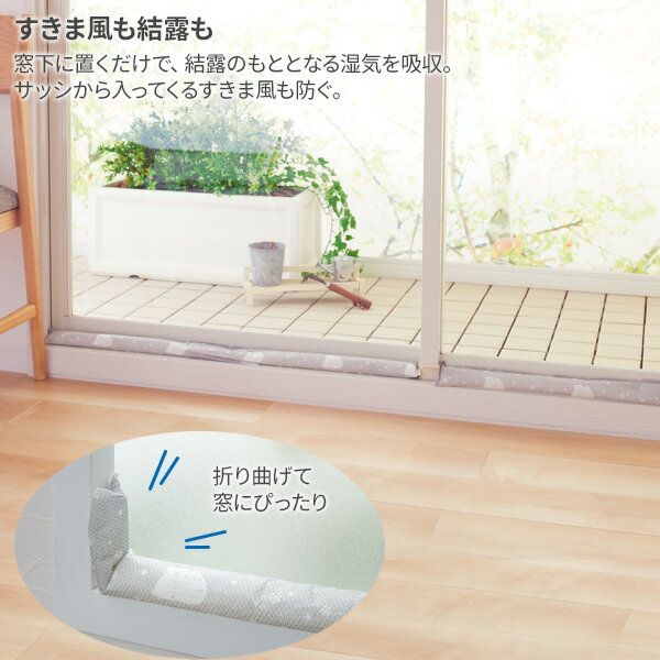 窓のすきま風と結露を防ぐ!窓下に置くだけで結露のもととなる湿気を吸収し、すきま風を防ぐクッション。窓の下(窓枠のミゾ部分や桟)に沿って置くだけ。クッションの中身がシリカゲルだから、結露の元である湿気を吸収します。天日干しすることで効果が復活。繰り返し使えます。(天気のいい日は窓枠に置いたままで自然に放湿しますが、5週間に1回は天日干しすることで効果が持続します)1本あたりの吸湿量は、約120ml。2本入だから大きな窓にも小さな窓にも使えます。ご使用方法(1)室内側の窓枠や窓ガラスについている油分、水分、汚れ、ホコリ等をよく拭き取り、乾燥させてください。(2)窓を閉めていただき、窓枠下部のすき間を隠すように置いてください。ご使用期間ご使用期間は約6ヶ月。保管する際は袋などに入れ、密閉して保管してください。ご注意電子レンジやドライヤーなどでの乾燥はしないでください。可燃性の素材ですので、火気に近づけないでください。窓の開閉は、必ず製品を取り除いてから行ってください。強く折り曲げたり、引っ張ったり、過度の圧力をかけると破れる恐れがあるのでご注意ください。1本あたりサイズ(約)幅52×奥行6×高さ1.5cm重量(約)400g材質B型シリカゲル、不織布(ポリエステル)吸湿量120ml品番H-3001製造国日本メーカーアールあわせて買いたい関連キーワード: 日本製 国産 窓枠 アルミサッシ サッシ 濡れる カビ ガラス窓 窓ガラス 水分 対策 DIY 置くだけ 簡単 寒冷地 雪国 水分 吸水 活性炭 解決 便利グッズ ライフハック 窓際 寒い 暖房 冬用 除湿 炭入り シリカゲル エコ 隙間風 すきま風 対策 防止 アイデアグッズ 人気 おすすめ 電気代 防寒 腐食防止 4900309026281
