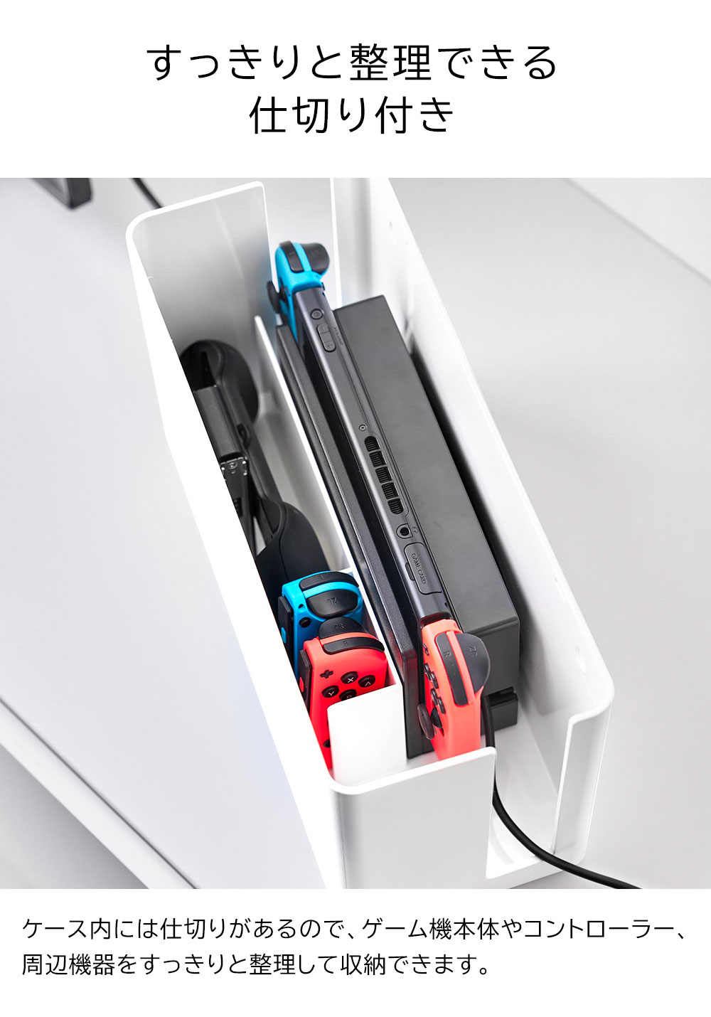 省スペースにすっきり!ゲーム機やコントローラーなどを省スペースに一括収納できる、蓋付きの重ねられる収納ケース。蓋を外せば2個までスタッキング可能で、省スペースにすっきり収納できます。きれいに収納できる仕切り付きなのでゲーム機本体やコントローラー、周辺機器を整理しやすく便利です。置き場所に困る小型ゲーム機も、充電しながら収納が可能なので、テーブルや床に置きっぱなしにならず、すっきり片付きます。蓋付きなのでほこりも防げます。壁に取り付けも可能壁の穴が目立ちにくい石こうボードピンで簡単に壁へ取り付けできるので、浮かせて収納可能。浮かせてあれば掃除もラクラク。収納できるゲーム機ニンテンドースイッチ、スイッチライト、スイッチ2取り付け可能な壁【石こうボードピン使用時】壁紙・布壁紙・ビニール壁紙貼りなどの石こうボード、薄ベニヤ付属品石こうボードピンセット(取り付けピース×2、クギ×6、キャップ×2)、緩衝材×2耐荷重(静止荷重)約1kg。ご注意シンナー・ベンジン・漂白剤・アルコール等のご使用は、表面を傷めたり、変形や変色の原因となりますのでおやめください。本製品で電化製品の電源コードを挟むなど無理な負荷をかけないでください。ゲーム機、HDD等の破損、損傷については一切の責任を負いかねますのでご了承ください。ゲーム機器等のサイズや形状によっては収納できない場合があります。サイズ(約)幅28.2×奥行11.5×高さ16.8cm 内寸サイズ(約)収納部/高さ15.5cm スリット部/奥行3×高さ13.5cm 重量(約)650g材質ABS樹脂品番10312製造国中国メーカー山崎実業