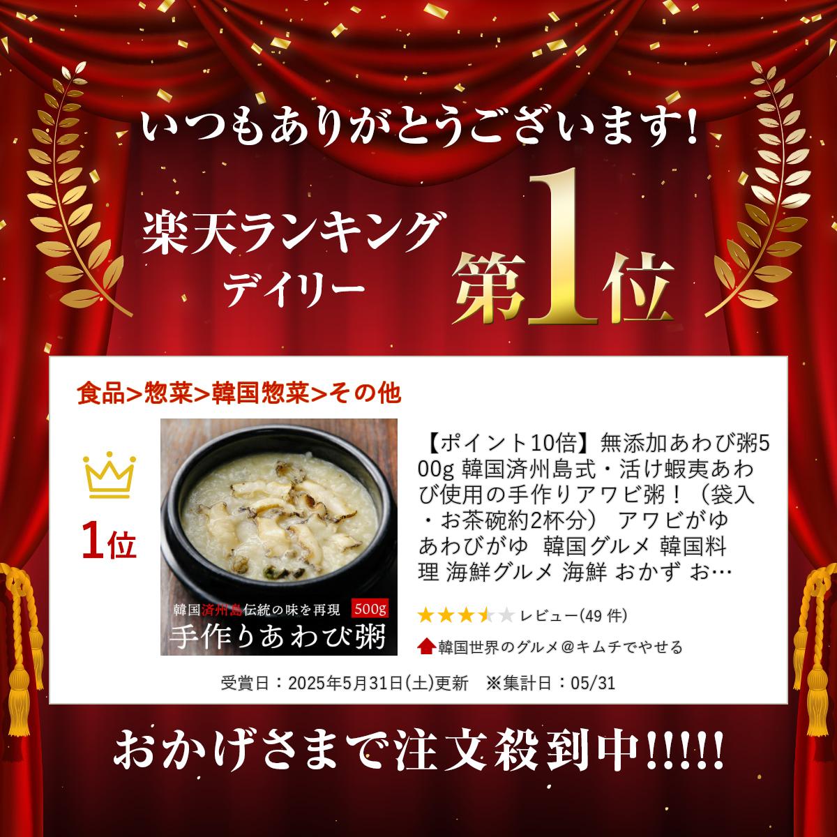 ■韓国では高級料理として愛されている手作りの「あわび粥」です。磯の香りが食欲をそそります!解凍後、電子レンジで約3分〜5分で出来あがり!簡単調理で本格的な韓国あわび粥が楽しめます。 手作り・無添加の本格派! 活け蝦夷あわびを使った韓国宮廷料理 あわび粥(チョンボッチュ)500g お粥専門店があるほど韓国のお粥文化は発達していますが、中でも韓国で一番愛されているお粥がこの「あわび粥」です。本品は、海産物の豊富な韓国・済州島に伝わる作り方で、アワビの内臓ごと長い時間煮込んだもので、緑がかった色合いが特徴です。余計な調味料を一切使わずに作っていますので、お好みで塩などを足してお召し上がり下さい。とっても香ばしい本場の味をそのまま楽しめます。栄養満点の朝食、昼食メニューとして、病中病後の「健康食」として、お疲れ気味の胃腸をいたわりスタミナを確保する品としてオススメです。 商品内容 ・活け蝦夷あわびのあわび粥500g(袋入) ※大阪鶴橋で作っています。 賞味期限 冷凍30日以上保証 配送方法 「冷凍便」でのお届けです。冷凍不可商品と同時ご注文の場合は、別途送料を頂戴する場合がございます。 原材料名 蝦夷あわび(韓国産)、もち米、米、ごま油、塩、(一部にあわび・ごまを含む) 販売者:ファイブ・イー・ライフ株式会社〒537-0024 大阪府大阪市東成区東小橋3-2-7TEL:06-6974-0055 メーカー希望小売価格はメーカーサイトに基づいて掲載しています韓国ドラマ「チャングムの誓い」に登場した韓国宮廷料理!滋養強壮食として愛されているあわび粥 活け蝦夷あわび使用の無添加調理!韓国・済州島式の素朴な旨味あふれる『手作りあわび粥』 磯の香りのするあっさりとした味わいのお粥です。 韓国ではお酒の後や、料理のしめくくりでよく食べられます。 韓国の人が大好きな「あわび粥」!最近では日本からのツアーでも、朝食は「あわび粥」というコースが増えています。 あわびといえば「高級食材」。 それは日本も韓国も同じですが、韓国ではあわびを「お粥」の材料として調理し、食べるのが一般的です。 お粥にするとあわびの量が少なくても、とても香ばしい香りがして食欲もそそります。 お粥メニューが豊富な韓国では「お粥専門店」があり、外食メニューとしても人気を博しています。 もちろん「専門店」でも一番人気はこの「あわび粥」。 お値段もお茶碗1杯分で8,000ウォン(約1,000円)〜15,000ウォン(約1,800円)となかなか高価なお粥です。 このお値段の幅は「あわびの入っている量次第」ですが、8,000ウォン程度なら1切れか2切れ入っていれば「御の字」です。 ●あわび粥の人気の秘密は「栄養」にあり! あわびはビタミンとカルシウム、リンなどのミネラルが豊富で、韓国では古くから「産後のお乳の出が悪い人はあわび粥を食べればいい」と言われていました。 お粥にすると疲れ気味の胃腸に優しく、栄養満点で「夏バテ」の時や「病中病後」の病人食としてもよく食べられています。 もちろん、健康な人の「体力増進」食としてもオススメです。 ●チャンジャ や 塩辛、水キムチと一緒に食べるのがオススメ! 本品は解凍後、電子レンジ対応容器に移し変えて約3分〜5分程度あたためるだけで出来あがります。 素材からの旨味を重視した調理法のため、味は薄味に仕上がっていますので、お好みで塩を入れていただいたり、「韓国海苔」を細かく刻んだものをのせたり、「ごま油」をさっとかけていただいてもおいしいです。 「あわび粥」と一緒に食べて欲しい品は「イカの塩辛」や「チャンジャ」。 お粥の中に入れてかき混ぜて食べるとまた違った風味が楽しめます。 キムチ類なら「水キムチ」と一緒に食べるのがオススメ。さっぱりとした美味しさがお粥とマッチして美味しくいただけます。 ●いろんな作り方がある「あわび粥」。 ●本品は韓国海産物のメッカ・済州島に伝わる料理法で作っています! 大阪・鶴橋コリアタウンには韓国・済州島出身の方がたくさんいらっしゃいます。 本品はそんな韓国・済州島に代々伝わる調理法で仕上げています。 そのポイントは、 「活けアワビだけを材料として使う!」 「アワビの内臓ごと一緒に米粒がほとんどトロトロになってしまうくらいまで長時間煮込む」というもの。 おかげでアワビの旨味とコクがすべてお粥に溶け込み、本当に香ばしくって独特の風味が楽しめます。 冷凍アワビや生け簀で弱ってしまったアワビだと、コクも旨味もまったくなくなり、本来の風味がまったく出ないんです。 だから、この「あわび粥」の原材料には、新鮮な「活け蝦夷あわび」だけを使っています。 その他の原材料も米とごま油と塩だけ。 余計な調味料や添加物は一切使っていない、 まさに伝統的な調理法による 素朴な中にも力強い風味が楽しめます。 写真が500gで、お茶碗にして約2杯分です。 手前の小さく見える緑色のモノが「済州島」方式の調理の場合のみに入る内臓です。 これが独特のコクと旨味を生み出します