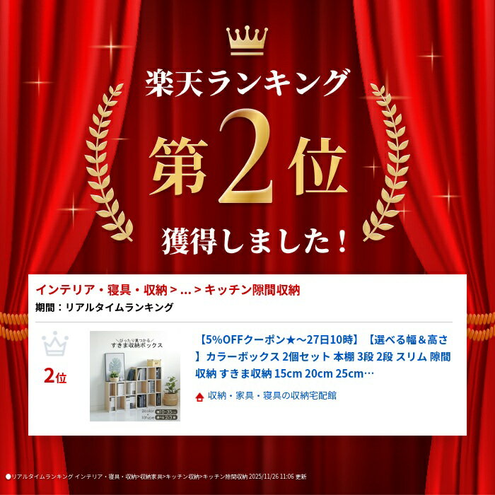 【2025年10月2日ページリニューアルしました】幅、段数を追加しました。 お部屋にできた隙間を有効活用できる、奥行29×高さ60/88cmタイプの木製ラックです。 幅は15cm・20cm・25cm・30cm・35cmの5タイプがそろっているので、お部屋の隙間に合わせて選べます。 連結用ボルトを使って、商品同士を縦方向・横方向に連結して使用することも可能です。 (※縦方向の連結は、安全のため、2つまでしかできません) また、棚は可動式になっているので入れるものに合わせて3.2cmのピッチで棚の高さを調節できます。 なお、この商品についてくる棚は2段タイプが1枚、3段タイプが2枚になります。 2個セットの商品は複数梱包での発送となります。大変恐れ入りますが、配送状況によっては各梱包のお届けに時間差が発生する場合がございます。各梱包の配送状況につきましては発送時に配信しておりますメール内に追跡URLを記載しておりますのでそちらよりご確認いただけますようお願い申し上げます。 ※写真は商品組み合わせ例となります。 ★商品詳細★ 【シリーズ共通】 ●お客様組み立て ●材質:プリント紙化粧パーティクルボード ●付属品:連結ボルト2本、プラキャップ12個、目隠しシール4枚、棚受けピン4個 ※プラキャップは側面板のネジ穴・連結穴隠し用、目隠しシールは底板の連結穴隠し用として使います。 【2段 幅15cm UB-6015】 ●商品サイズ(cm):幅約15×奥行約29×高さ約60 ●耐荷重 全体:約16kg、棚板1枚あたり:約8kg ●棚板サイズ(約):幅12cm×奥行27cm 【2段 幅20cm UB-6020】 ●商品サイズ(cm):幅約20×奥行約29×高さ約60 ●耐荷重 全体:約20kg、棚板1枚あたり:約10kg ●棚板サイズ(約):幅17cm×奥行27cm 【2段 幅25cm UB-6025】 ●商品サイズ(cm):幅約25×奥行約29×高さ約60 ●耐荷重 全体約24kg、棚板1枚当り約12kg ●棚板サイズ(約):幅22cm×奥行27cm 【2段 幅30cm UB-6030】 ●商品サイズ(cm):幅約30×奥行約29×高さ約60 ●耐荷重 全体:約28kg、棚板1枚あたり:約14kg ●棚板サイズ(約):幅27cm×奥行27cm 【2段 幅35cm UB-6035】 ●商品サイズ(約):幅35×奥行29×高さ60cm ●耐荷重(約):全体32kg、棚板1枚当り16kg ●棚板サイズ(約):幅32cm×奥行27cm 【3段 幅15cm UB-9015】 ●商品サイズ(cm):幅約15×奥行約29×高さ約88 ●耐荷重 全体:約24kg、棚板1枚あたり:約8kg ●棚板サイズ(約):幅12cm×奥行27cm 【3段 幅20cm UB-9020】 ●商品サイズ(cm):幅約20×奥行約29×高さ約88 ●耐荷重 全体:約30kg、棚板1枚あたり:約10kg ●棚板サイズ(約):幅17cm×奥行27cm 【3段 幅25cm UB-9025】 ●商品サイズ(cm):幅約25×奥行約29×高さ約88 ●耐荷重 全体:約36kg、棚板1枚あたり:約12kg ●棚板サイズ(約):幅22cm×奥行27cm 【3段 幅30cm UB-9030】 ●商品サイズ(cm):幅約30×奥行約29×高さ約88 ●耐荷重 全体:約42kg、棚板1枚あたり:約14kg ●棚板サイズ(約):幅27cm×奥行27cm 【3段 幅35cm UB-9035】 ●商品サイズ(約):幅35×奥行29×高さ88cm ●耐荷重(約):全体48kg、棚板1枚当り16kg ●棚板サイズ(約):幅32cm×奥行27cm (検索用:隙間収納 すきま 収納 すき間収納 カラボ 収納ボックス スリム コンパクト 子供部屋 子ども部屋 絵本収納 おもちゃ収納 かわいい ツートン 4905009372874 4905009564057 4905009372881 4905009564064 4905009372898 4905009564071 4905009372904 4905009564088 4905009421800 4905009564149 4905009372911 4905009564095 4905009372928 4905009564101 4905009372935 4905009564118 4905009372942 4905009564125 4905009421817 4905009564156) 最強翌日配送対象商品に関するご案内 最強翌日配送対象商品・対象地域に該当する場合は最強翌日配送マークがご注文カゴ近くに表示されます。 最強翌日配送可能なお支払方法は【クレジットカード、代金引換、全額ポイント支払い】のみとなります。 下記の場合は最強翌日配送対象外となります。 ・15点以上ご購入いただいた場合 ・時間指定がある場合 ・ご注文時備考欄にご記入がある場合 ・決済処理にお時間を頂戴する場合 ・郵便番号や住所に誤りがある場合 ・最強翌日配送対象外の商品とご一緒にご注文いただいた場合 ・お届け先住所文字数が40文字以上の場合 お届け先が沖縄・離島の場合、お届け日時のご希望に沿えない場合がございます。予めご了承ください。 ご注文前のよくある質問についてご確認下さい[ FAQ ] 本棚ランキング おすすめ商品 ▼人気No.1▼ ▼人気No.2▼ ▼人気No.3▼ 本棚をキーワードから探す ▶人気NO.1▶扉付き ▶スリムタイプ ▶大容量 ▶スライド式 ▶回転