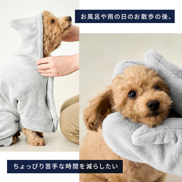 すぐ着られて、すぐ拭ける。わんちゃん・ねこちゃん兼用、ミトン付きペットローブ。体拭きを癒しとふれあいの時間に。【マイクロファイバー素材】マイクロファイバー素材が水分をしっかり吸収。早く乾きやすく、ドライヤー時間の短縮に!ローブとミトンはループ付きなので、かけて保管・乾燥にも便利。【面ファスナー付き】腕回り、胴回りは面ファスナーで調節可能!さらに面ファスナーは毛が絡まりにくい素材なので安心。【フードとミトン付き】頭まですっぽり包めるフード付き。さらにミトンで撫でながら拭けば、頭や手足もすみずみまで拭きやすい。●製品内容ローブ本体、ミトン×2●製品サイズ(cm)ローブ本体:首回り約41〜44/胴回り約47〜65/背丈約81/前脚丈約48(Lサイズ)ミトン:全長約25×掌幅約13●Lサイズ対応犬種(参考標準体型)柴犬、日本スピッツ、ビジョンフリーゼ等※メスの場合です。オスの場合は、ワンサイズ上を目安にしてください。※上記のサイズに対する犬種はあくまでも目安です。愛犬のサイズを必ずご確認の上、ご使用ください。※毛量が多い場合はその分も考慮頂きサイズをお選びください。●製品質量(本体+ミトン)約396g●組成ポリエステル87%、ナイロン13%●洗濯表示※他の製品と一緒に洗わず、単独で洗ってください。※素材の特性上、他のものに毛羽や毛玉が付くことがあります。※強い摩擦や高温・多湿な環境における長時間の接触において、色落ち・色移りする可能性がありますのでご注意ください。(検索用:犬 タオル バスローブ ペット用バスタオル ペットローブ L ミトン付き 拭きやすい 犬 4967576697101) 最強翌日配送対象商品に関するご案内 最強翌日配送対象商品・対象地域に該当する場合は最強翌日配送マークがご注文カゴ近くに表示されます。 最強翌日配送可能なお支払方法は【クレジットカード、代金引換、全額ポイント支払い】のみとなります。 下記の場合は最強翌日配送対象外となります。 ・15点以上ご購入いただいた場合 ・時間指定がある場合 ・ご注文時備考欄にご記入がある場合 ・決済処理にお時間を頂戴する場合 ・郵便番号や住所に誤りがある場合 ・最強翌日配送対象外の商品とご一緒にご注文いただいた場合 ・お届け先住所文字数が40文字以上の場合 関連キーワード(本商品の説明ではありません)母の日 父の日 敬老の日 こどもの日 クリスマス バレンタイン ホワイトデー ハロウィン お正月 成人の日 成人式 記念日 誕生日 卒業式 入学式 お歳暮 お中元 春 夏 秋 冬 梅雨 節分 ひな祭り 七夕 十五夜 初詣 年越し 夏祭り 花火大会 結婚祝い 内祝い 出産祝い 快気祝い 還暦祝い 古希 喜寿 傘寿 米寿 卒寿 白寿 百寿 新築祝い 引っ越し祝い 開店祝い 開業祝い 就職祝い 昇進祝い 合格祝い 銀婚式 金婚式 七五三 長寿祝い 御礼 お母さん お父さん 義母 義父 祖父 祖母 おばあちゃん おじいちゃん 娘 息子 彼氏 彼女 恋人 友達 上司 先輩 後輩 同僚 キッズ 子供 幼児 ベビー 赤ちゃん 育児 学生 社会人 シニア 10代 20代 30代 40代 50代 60代 70代 80代 90代 一人暮らし 単身赴任 主婦 主夫 新生活 家族暮らし 子育て 旅行 トラベル ライブ ホームパーティ ビジネス 法人 ギフト プレゼントSサイズはこちら Mサイズはこちら Lサイズはこちら