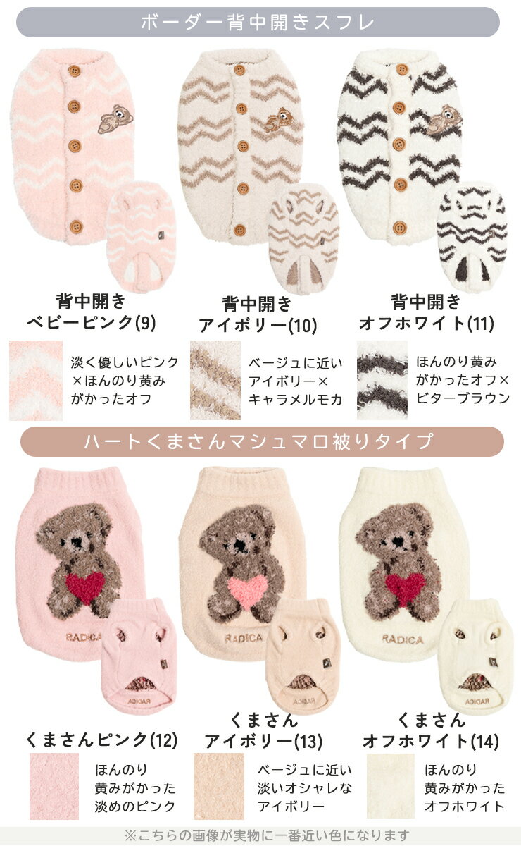 ※展開サイズ: SS S M L LL 3L SD MD LD 柴L 柴LL 柴3L 商品カテゴリ:アウター 2025 秋 冬 新作 男の子 女の子 秋冬 秋用 冬用 防寒対策 寒さ対策 あったか 暖かい 超小型犬 小型犬 中型犬 大型犬 犬服 犬の服 ドッグウェア いぬふく ピンク くま アイボリー クマ トイプードル チワワ ミニチュアダックス ダックス ポメラニアン シュナウザー ミニチュアシュナウザー ヨーキー ヨークシャテリア シーズー マルチーズ パピヨン ピンシャー ボストンテリア shiba 豆柴 柴犬 キャバリア アメリカンコッカー イングリッシュコッカー ウエスティ コーギー フレブル パグ フレンチブルドッグ シェットランドシープドッグ ジャックラッセルテリア パピー メーカー希望小売価格はメーカーカタログに基づいて掲載しています【注意事項】 ※商品画像の色味について 商品写真はできる限り実物の色に近づけるよう徹底しておりますが、お使いのモニター設定、お部屋の照明などにより 実際の商品と色味が異なる場合がございます。予めご了承ください。 ※サイズについて サイズ表の着丈は実寸です。(商品により若干の差があります) 首周り、胴周りはペットのヌード寸法(お洋服を着ていない状態)です。 お洋服を脱いだ状態でサイズを測ってください。 ワンちゃんを立たせた状態で、指一本分のゆとりをもってサイズ測定してください。 ※お洋服の素材について ・レース付きの場合 衿のレース部分のリボン装飾は強く引っ張ったり、後ろ足で首元を掻くなどすると紐状のチュールが抜けて しまう可能性がございます。 ・ニット素材の場合 かみつき・ひっかき癖のあるワンちゃんは、生地にほつれが生じる可能性がございます。 ご了承の上お買い求めいただけますようお願いいたします。 ※ボタン・リボン付きのお洋服につきまして 下記のようなワンちゃんへのご使用は、誤飲などの可能性があります。 特にご注意ください。 ・噛み癖がある ・洋服などで遊んでしまう ・多頭飼いで他のワンちゃんのボタン、リボンを噛んでしまう ※ご使用について 濡れた状態でお使い頂くと、色移りする可能性がございますのでご注意ください。 事故防止のため、ワンちゃんに合うサイズでご使用ください。 ※その他 販売期間経過後も、継続してまたは、数日中に販売を行う可能性があります。また、価格についても値下げする 場合があります。予めご了承ください。 買い物カゴにないカラー、サイズは全て完売となっております。 ■ ラディカウエアについて RADICAのウエアは、アパレル出身で愛犬家のデザイナーとパタンナーがこんなお洋服があったらワンちゃんと オーナーさんとの時間がより一層楽しくなるのでは?を想像しながら企画開発しています。 RADICAでは全てのお洋服が、ワンちゃんにお洋服を着せない裸の寸法(ヌード寸法)でのご案内となっています。 ヌード寸法を計測したサイズにてお買い求めください。 生地の厚さや伸縮性、デザインや仕様によってパターンサイズに変化をつけているので仕上がりサイズは一定では ございません。 またワンちゃんの体格(腕や足の長さや太さ、胸の張りなど)や毛量の影響でお洋服によって着脱のしやすさや 着用感に差が出る場合がございます。 その旨ご留意いただけますようお願いいたします。 ■ ご購入前にサイズのご確認をお願いします。 サイズに悩んだ場合はお気軽にお問い合わせください! >> モデルのサイズ詳細はこちら >> モデルワンちゃんたちの着比べはこちら >> 『お洋服のケア方法 』詳細はこちら >> 『マシュマロ&スフレニット』の他デザインはこちら! >> ■ ブランド一覧 ● 【RADICA+Y】いい商品をお手軽に。 >> 【Radymore】もっとオシャレに。楽しく。心地よく。 >> 【BELLIMBUSTO】機能的でスタイリッシュ。 >> 【une brise】よりナチュラルに、とことん素材にこだわって。 >> ■【メール便配送】につきまして、詳細を必ずご確認ください。 >>>