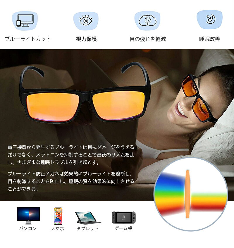 商品説明 380~510nmのブルーライトのカット率は99.9%になります。 本来なら眠るべき時間にまだPCの前にいたり、寝る前にスマホをいじったり。 脳を休めるべき時間にまでブルーライトを浴び続けることによって脳が刺激さ れ、体内時計にずれが生じてくる。そうすると睡眠の質の低下に繋がり、それ が続くことによって体調不良を引き起こす可能性があります。 夜遅くまでパソコン作業をしたり、就寝前にスマホを使用し寝つきが悪い方を この眼鏡がサポートします。 夜や就寝前の1~2時間、スマホやパソコンを使用する方、つい暗い部屋でスマ ホをいじってしまう方、夜のスマホやパソコン作業により快適な睡眠ができず 不眠症気味の方に特におすすめ! PC,スマホ,TV等のディスプレー以外を見る際は見辛く、逆に眼精疲労につなが る為、ご使用をお控えください。 キーワード 関連キーワード:ブルーライトカット メガネ 度なし 99.9% 眼鏡 軽量 メンズ レディース 子供 吸収タイプ 夜用 PCメガネ PC眼鏡 めがね パソコン用メガネ スマホ ゲーミング パソコン おしゃれ ブルーカットグラス メガネケース uvカット 紫外線カット 宅配便送料無料